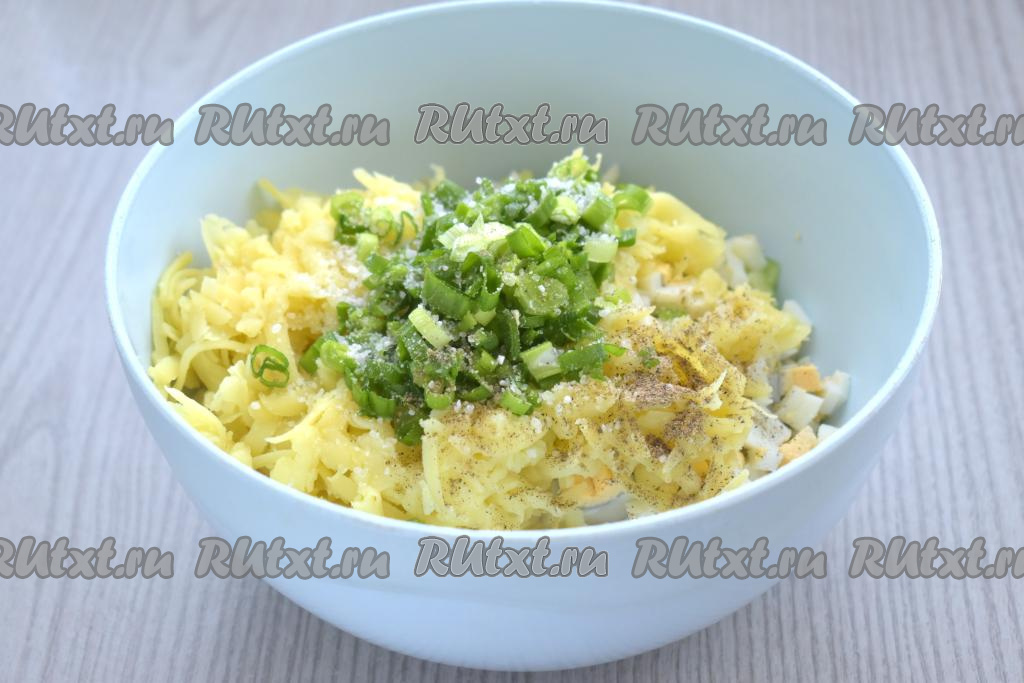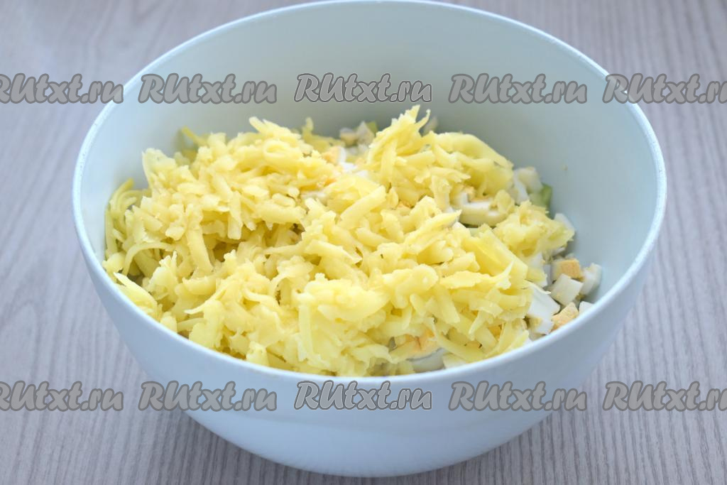 Сюда же выкладываем очищенную варёную картошку, натёртую на крупной тёрке.