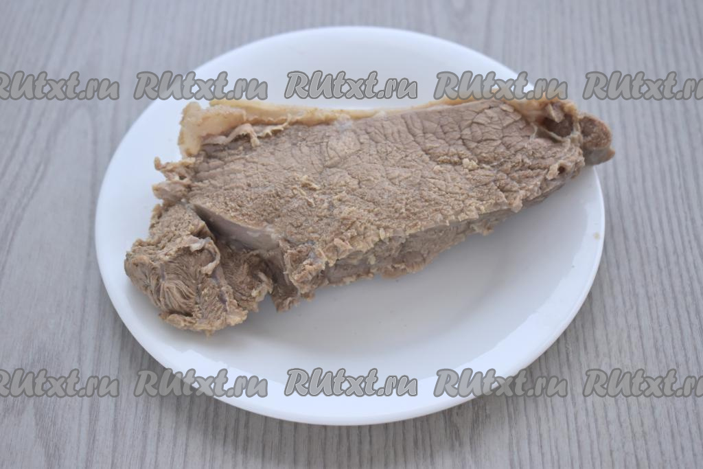 Сперва нужно сварить говядину, для этого вымытое мясо нужно выложить в кастрюлю, залить полностью водой, поставить на огонь, после закипания воды, убавив огонь, отварить до готовности (ориентировочно с момента закипания воды на варку потребуется 1,5 часа). В отдельной кастрюле, не очищая от кожуры, отварить до готовности картофель (в течение 25-30 минут с момента начала кипения воды, готовые клубни будут легко прокалываться ножом). Яйца отварить в течение 10 минут после закипания воды. Варёной говядине, картошке и яйцам даём полностью остыть.
