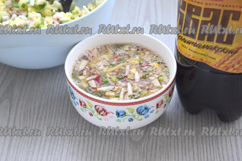 Раскладываем получившийся салат по глубоким тарелкам, заливаем холодным квасом и подаём окрошку с говядиной к столу. При таком варианте подачи, добавляя больше или меньше кваса в каждую тарелку, вы можете регулировать густоту окрошки, учитывая предпочтения каждого члена семьи. Но, безусловно, можно и сразу в миску с салатом влить квас, перемешать, а после этого разливать окрошку по тарелкам. Тут уж решайте сами, какая подача вам больше нравится.