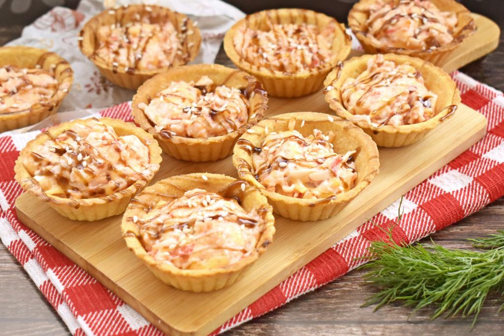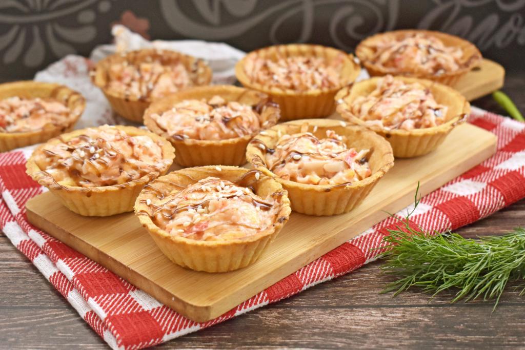 Тарталетки с разнообразными начинками - отличный вариант порционной подачи закусок. В этот раз предлагаю запечь в духовке покупные песочные тарталетки, наполненные смесью из крабовых палочек, творожного сыра и подкопчённой (или копчёной икры). В результате получается вкусная, аппетитная, пикантная горячая закуска, которую можно подать и к семейному застолью, и к праздничному столу. Рецепт простой, а результат - удачный, советую и вам приготовить!
