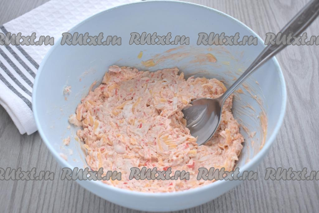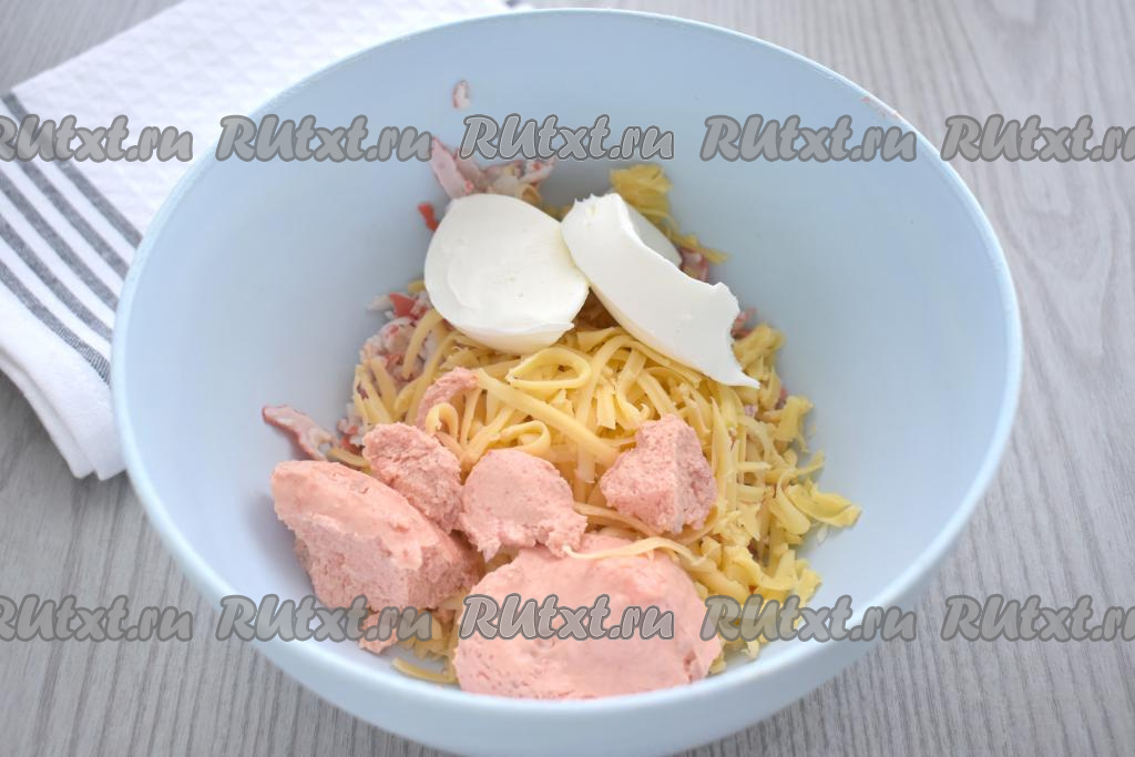К крабовым палочкам и натёртому твёрдому сыру выкладываем творожный сыр и икру.