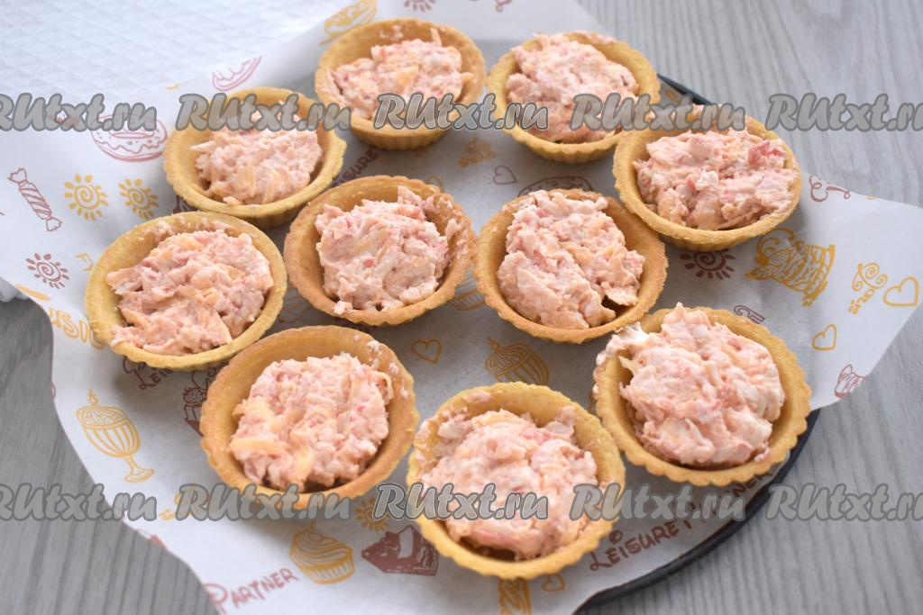 Песочные тарталетки наполняем начинкой из крабовых палочек, творожного сыра, икры и твёрдого сыра. Я наполнила 10 тарталеток. Форму для запекания (или противень), по желанию, застилаем пергаментом, затем расставляем тарталетки с начинкой и отправляем в духовку, разогретую до 180 градусов, на 8-9 минут (до появления на поверхности небольшой аппетитной корочки).
