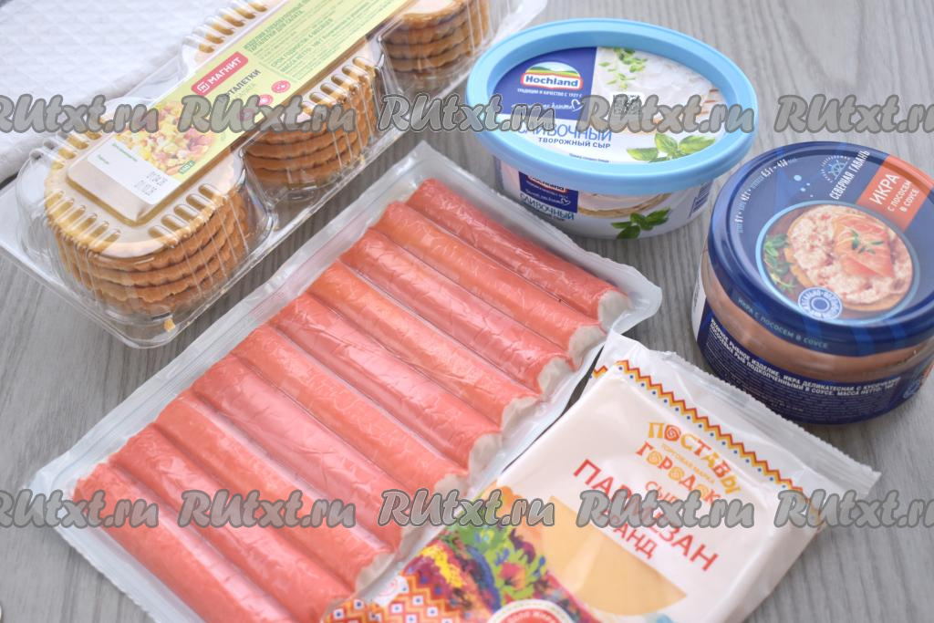 Подготовим продукты. Для этого блюда можно взять недорогую подкопчённую или копчёную икру (например, икру мойвы, салаки, щуки или, как у меня, лосося в соусе). Крабовые палочки, если они заморожены, нужно будет полностью разморозить при комнатной температуре. Песочные тарталетки можно купить практически в любом продуктовом магазине.