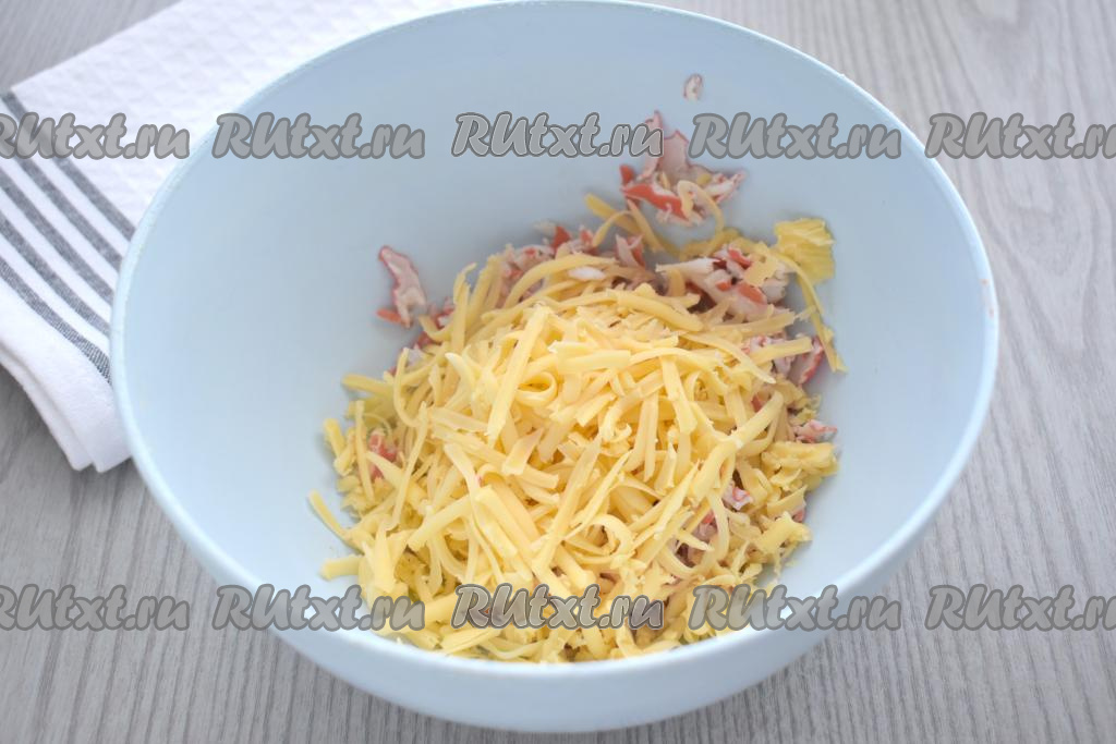 Твёрдый сыр натираем на крупной тёрке, добавляем в миску с крабовыми палочками.
