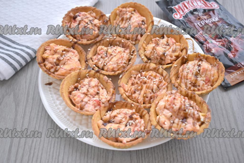 Готовые тарталетки достаём из духовки, по желанию, украшаем соусом "Терияки", посыпаем кунжутом.