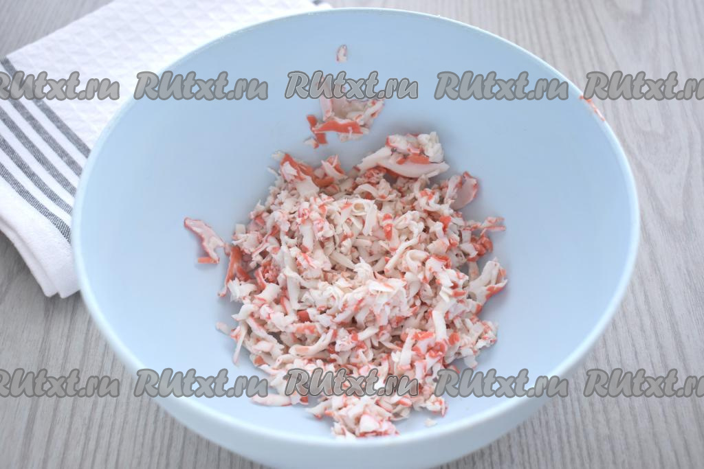 Крабовые палочки вынимаем из упаковки, натираем на крупной тёрке (или нарезаем на мелкие кубики), выкладываем в глубокую миску.