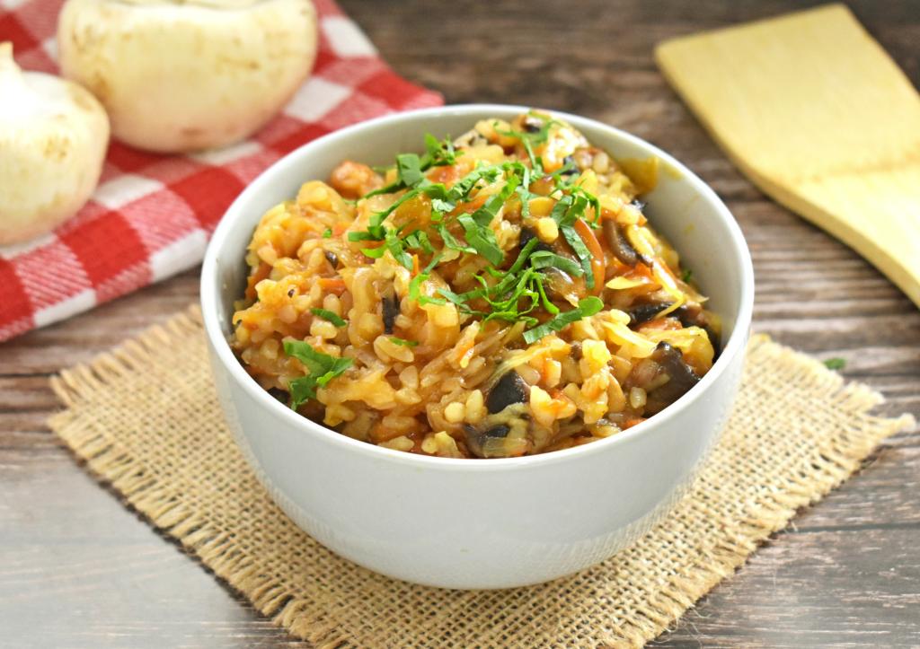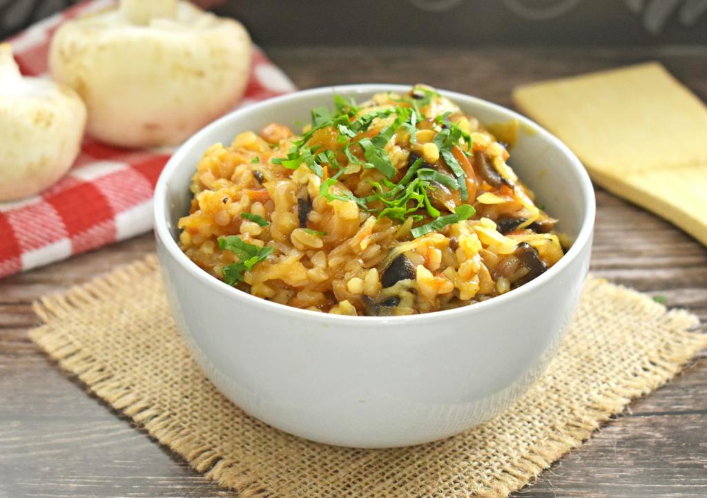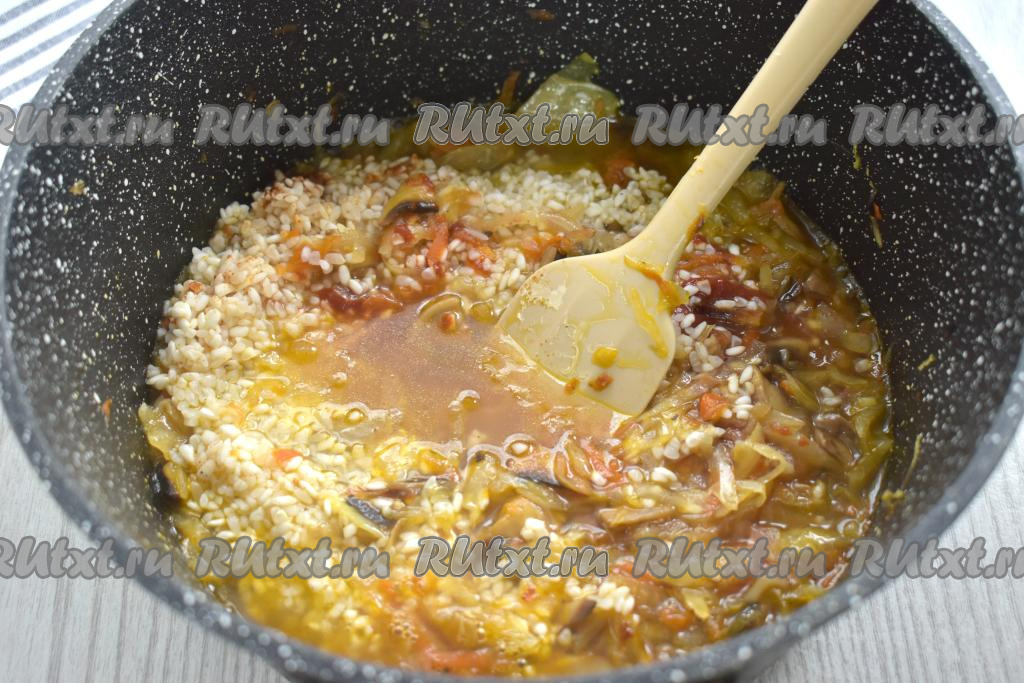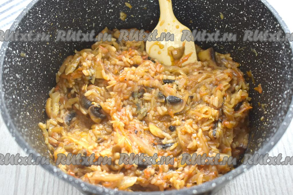Вливаем 230 миллилитров кипящей воды, перемешиваем рис с капустой и грибами. Ещё раз даём воде закипеть.