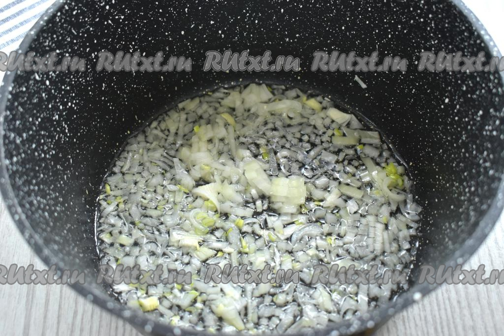 Лук и морковь очищаем. Капусту промываем водой. В глубокой сковороде (или в кастрюле с толстым дном, или в казане) разогреваем растительное масло на достаточно сильном огне, уменьшаем огонь до среднего, выкладываем мелко нарезанный лук. Обжариваем лук до мягкости (в течение 3-4 минут), не забывая периодически перемешивать, чтобы он не подгорел.