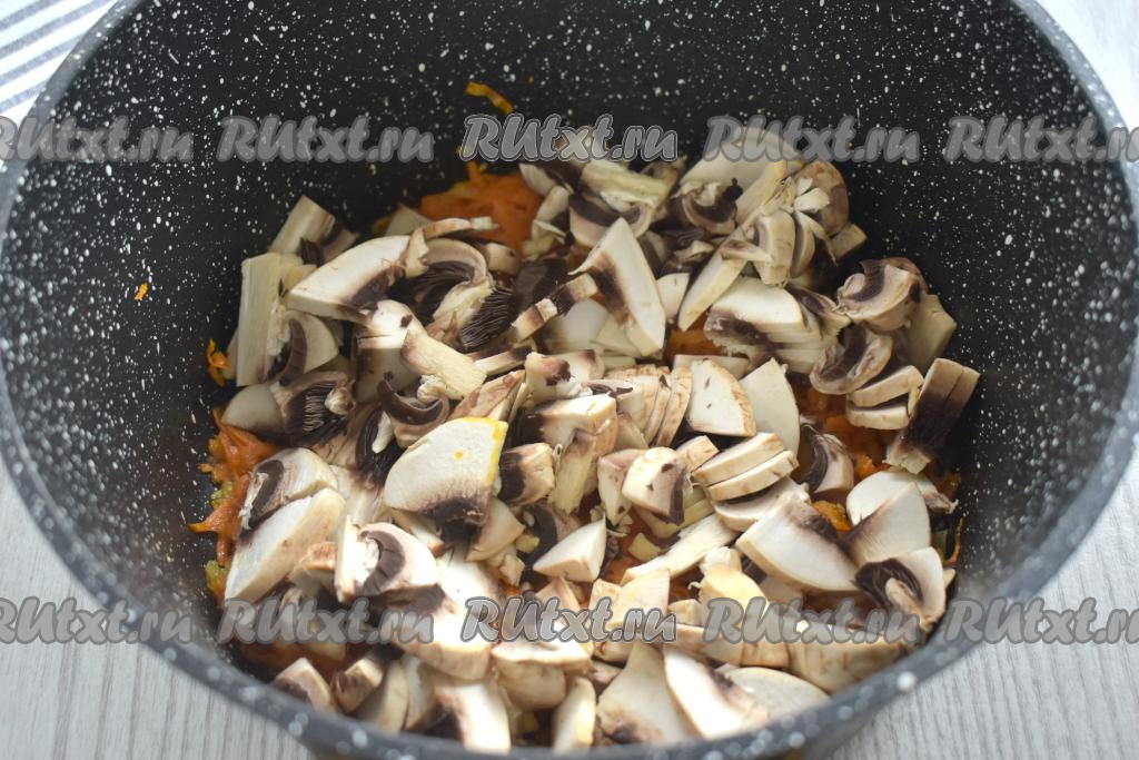 Пока обжариваются овощи, моем шампиньоны, нарезаем их на небольшие кусочки. После того как морковка станет достаточно мягкой, добавляем к обжаренным овощам нарезанные грибы, перемешиваем, обжариваем 6-7 минут, иногда помешивая.