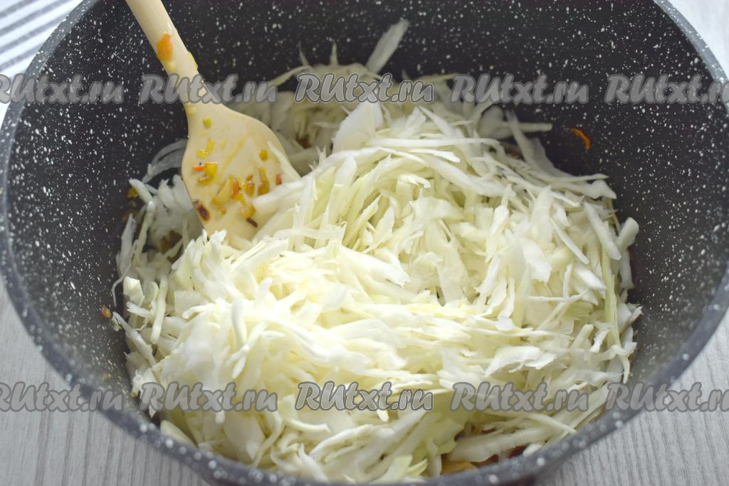 К грибам, обжаренным с овощами, выкладываем капусту, нарезанную на тонкие полоски, перемешиваем. Обжариваем капусту с шампиньонами минут 10-12 (капуста должна стать более мягкой, уменьшившись в объёме). Для того чтобы капуста не пригорела, в процессе жарки вливаем к ней 70 миллилитров воды.