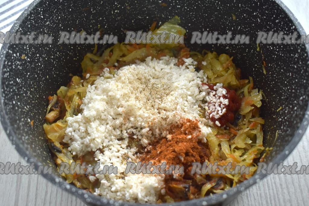 Рис хорошо промываем под проточной водой, лишней воде даём стечь. По прошествии 10-12 минут с начала обжаривания капусты добавляем подготовленный рис, томатную пасту, соль и специи по вкусу (в качестве специй я добавила паприку и чёрный молотый перец).