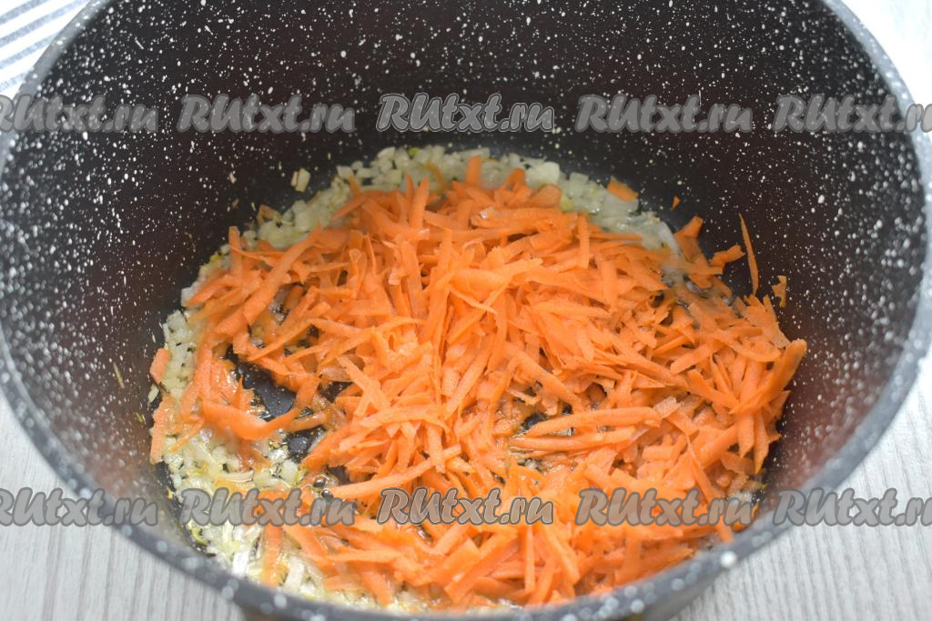 После того как лук станет мягким, добавляем к нему морковку, натёртую на крупной тёрке, перемешиваем овощи, готовим их 5 минут (морковь должна стать достаточно мягкой), время от времени перемешивая.