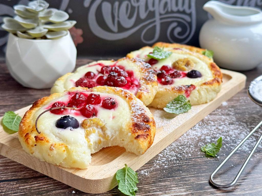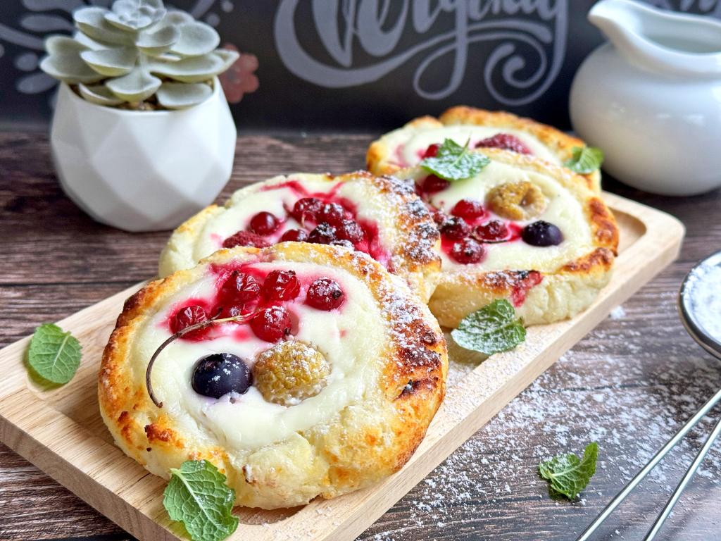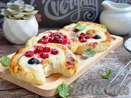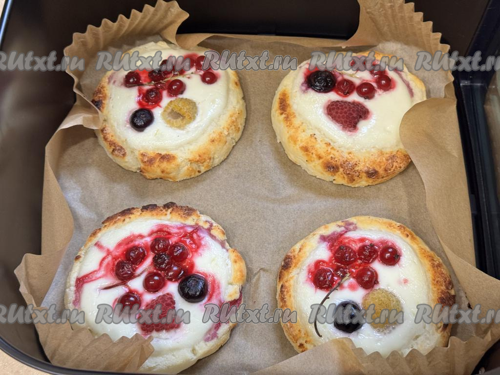 Готовые творожные ватрушки с ягодами достать из аэрогриля, дать слегка остыть и можно подавать нежную, аппетитную выпечку к столу.