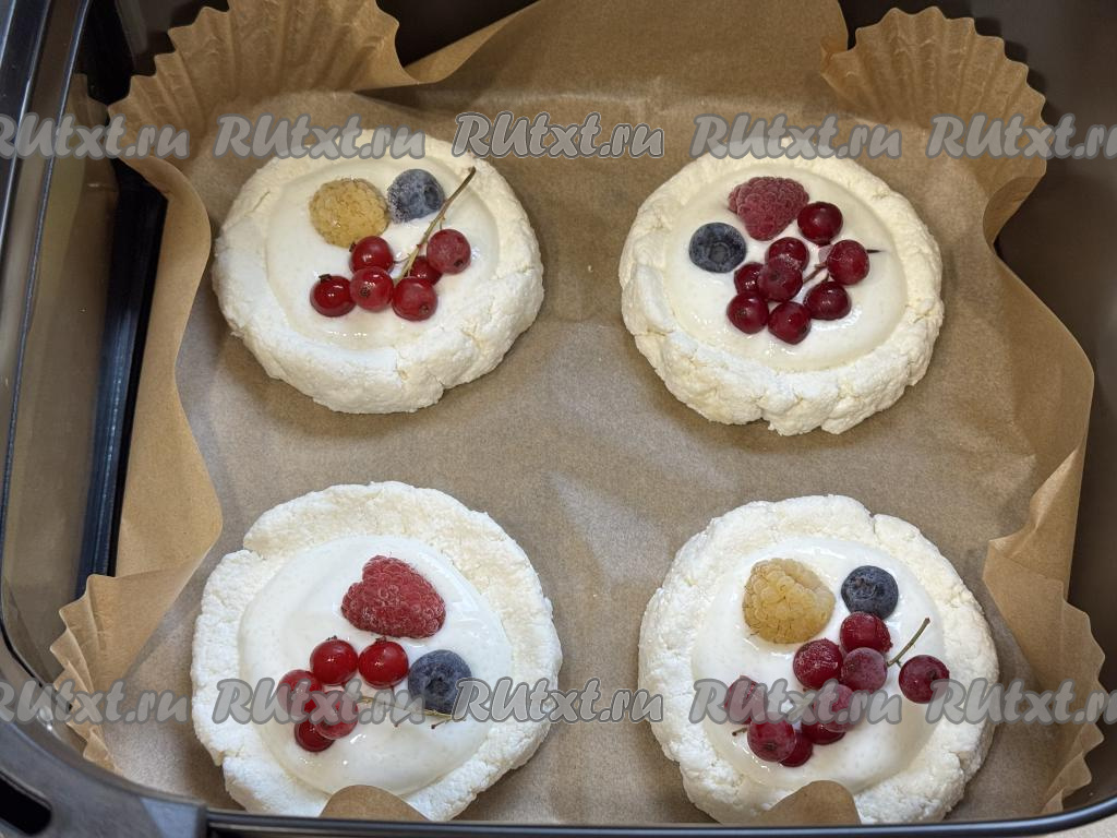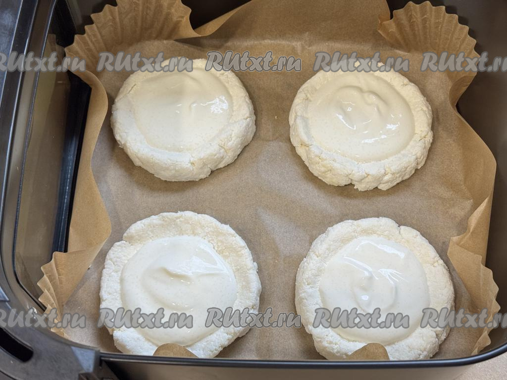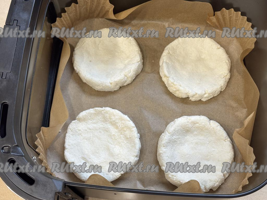 Дно чаши аэрогриля застелить пергаментом. Сформировать руками из каждой части творожного теста круглую ватрушку с бортиком. 4 сформированных заготовки ватрушек выложить в чашу аэрогриля.