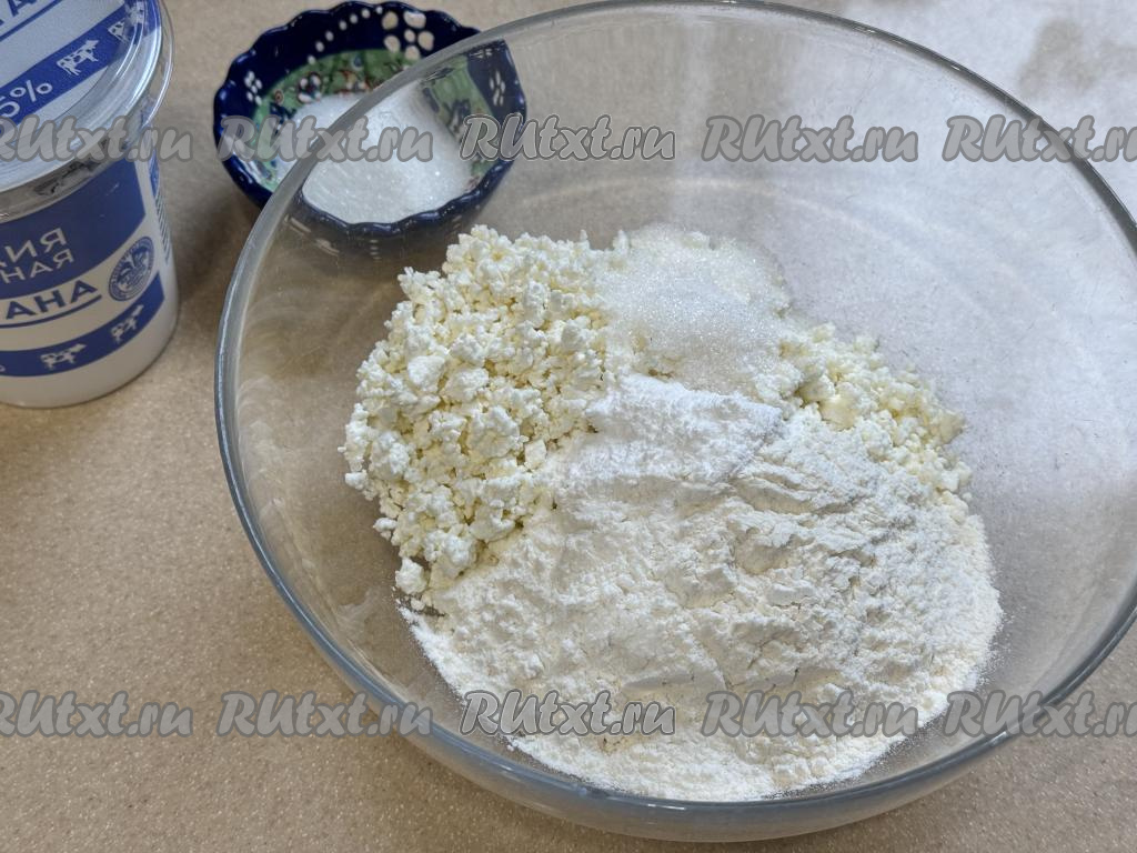 В миске соединить творог, сахар, разрыхлитель, соль и муку, вначале растереть тесто вилкой.
