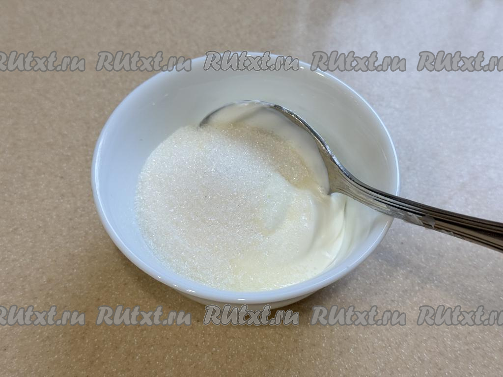 Для приготовления начинки соединить в глубокой миске сметану и сахар, перемешать столовой ложкой до однородности.