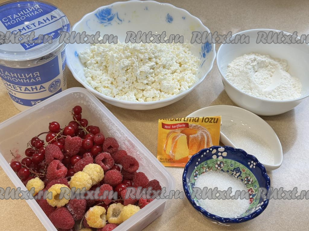 Подготовить продукты. Творог можно использовать любой жирности (я купила жирностью 9%). Сметану желательно брать жирностью не менее 15% (я использовала жирностью 15%). Ягоды можно взять как свежие, так и замороженные. Замороженные ягоды, если на них нет большого количества льда, размораживать не нужно. Свежие ягоды нужно будет промыть водой, обсушить, разложив на бумажном полотенце.