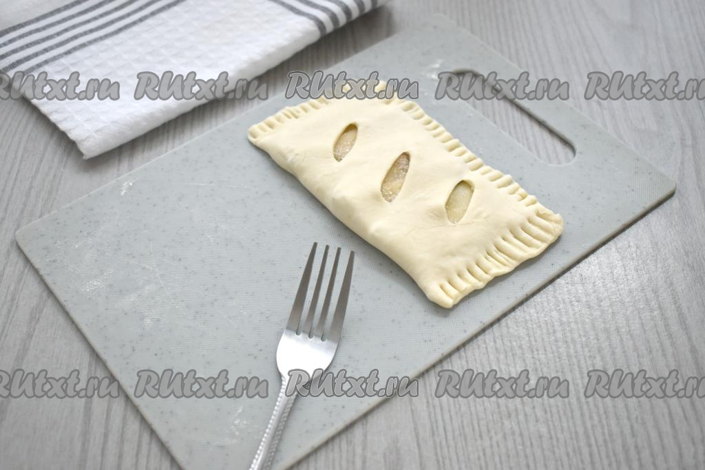 Стороной квадрата с разрезами накрываем сторону с начинкой. Вилкой тщательно скрепляем края слойки. Для того чтобы вилка не липла к тесту, можно периодически окунать зубцы вилки в муку. Аналогично формируем ещё 3 слойки с грушами.