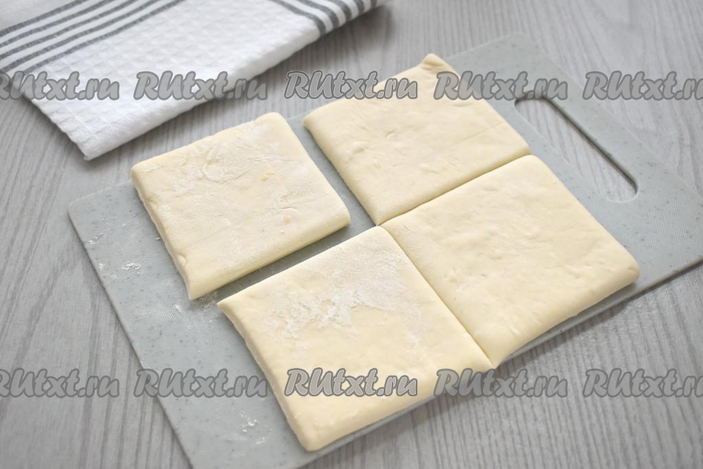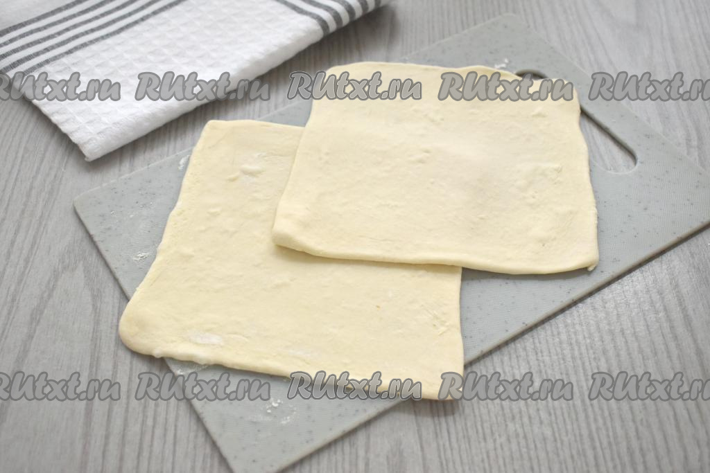 Каждую часть слоёного теста раскатываем скалкой в квадрат с размером стороны 15 сантиметров.