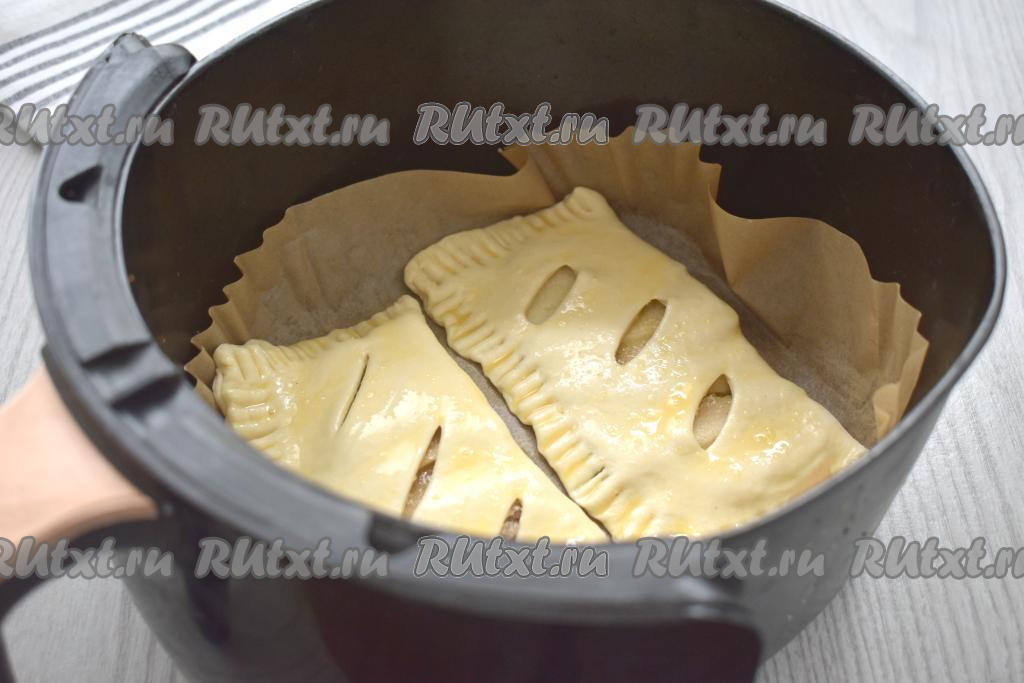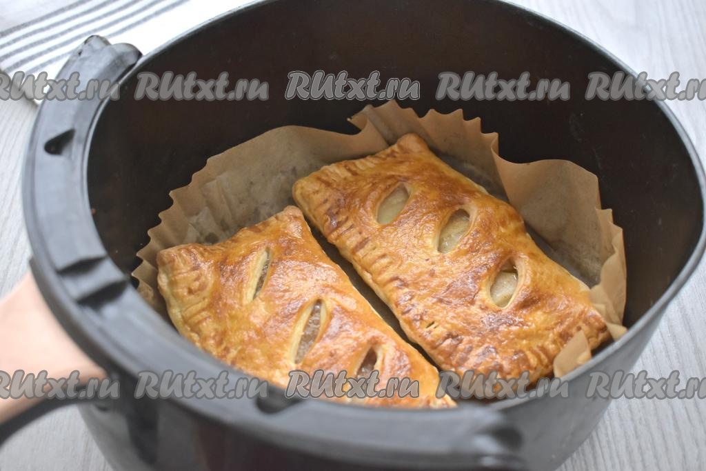 По прошествии 10 минут с начала выпечки слоек с грушами, достаём чашу из аэрогриля, слойки переворачиваем и выпекаем оставшиеся 10 минут (выпечка должна приятно подрумяниться с двух сторон). Я готовила в аэрогриле мощностью 1400 Ватт с 1 ТЭН-ом, по прошествии 20 минут слойки были полностью готовы. Достаём готовую выпечку из аэрогриля. Аналогично смазываем яйцом и выпекаем в аэрогриле оставшиеся две слойки.