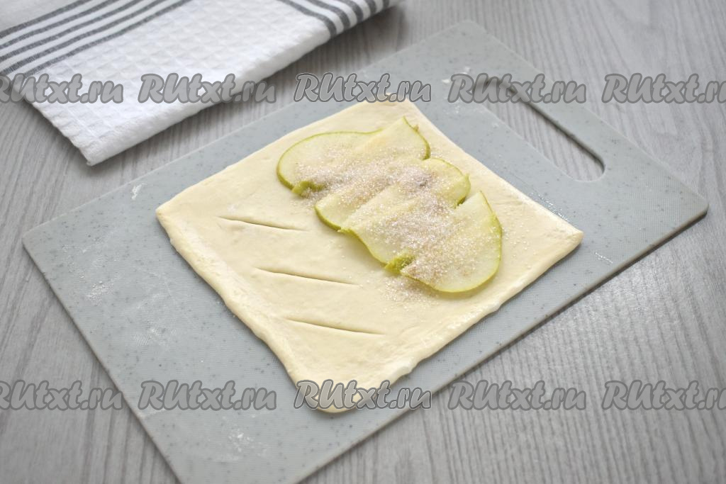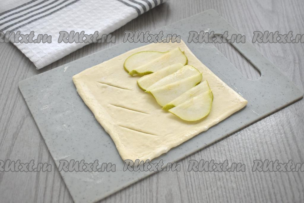 Берём первый получившийся квадрат из теста, зрительно делим его на 2 равных части. Грушу, по желанию, очищаем от кожуры (я очищать от кожуры не стала), нарезаем на тонкие ломтики, вырезая сердцевину с косточками. На одну половину квадрата выкладываем немного внахлёст 1/4 часть ломтиков груши, отступая от краёв теста по 1-1,5 сантиметра. На второй половине квадрата делаем разрезы, как на фото, тоже не забывая отступить от краёв теста.