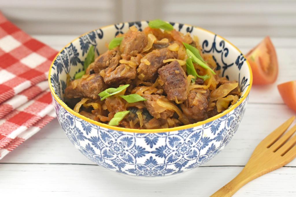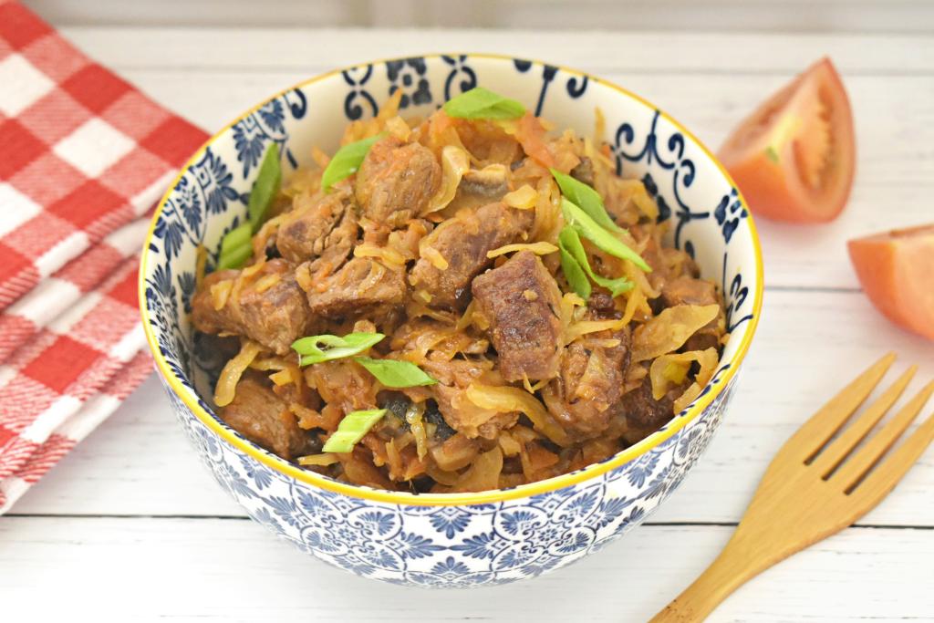 Я часто включаю тушёное мясо в меню своей семьи. В этот раз решила потушить говядину с капустой и грибами. В результате получилось сытное, вкусное, насыщенное блюдо, которое можно подать и на обед, и на ужин. Все ингредиенты прекрасно сочетаются и дополняют друг друга. Кусочки говядины в процессе тушения становятся мягкими, капуста - сочной, шампиньоны - нежными. При подаче это блюдо можно дополнить свежими или консервированными овощами.