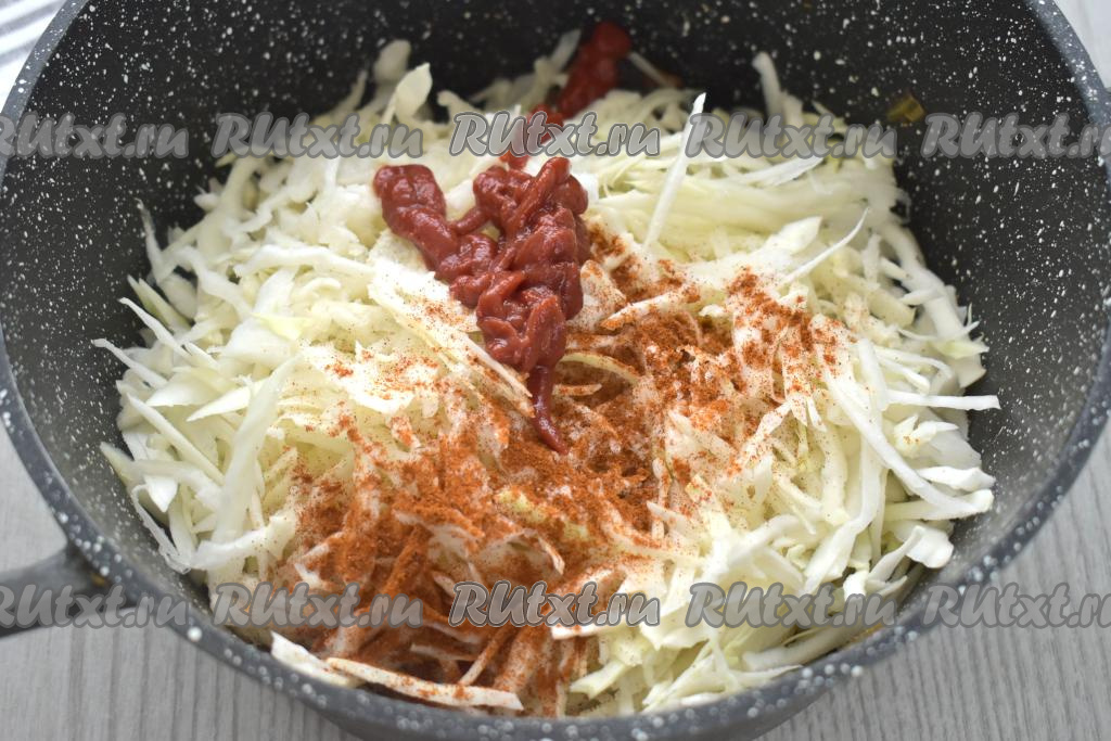 Выкладываем томатную пасту и любимые специи (в качестве специй я добавила паприку и чёрный молотый перец), перемешиваем, вливаем 100 миллилитров воды. Даём воде закипеть, убавляем огонь, накрываем крышкой, тушим минут 20-25 (и капуста, и говядина должны стать мягкими), иногда перемешивая. Продолжительность тушения во многом зависит от сорта капусты. У меня капуста была готова через 20 минут, но если капуста зимних сортов, то может потребоваться и минут 30.