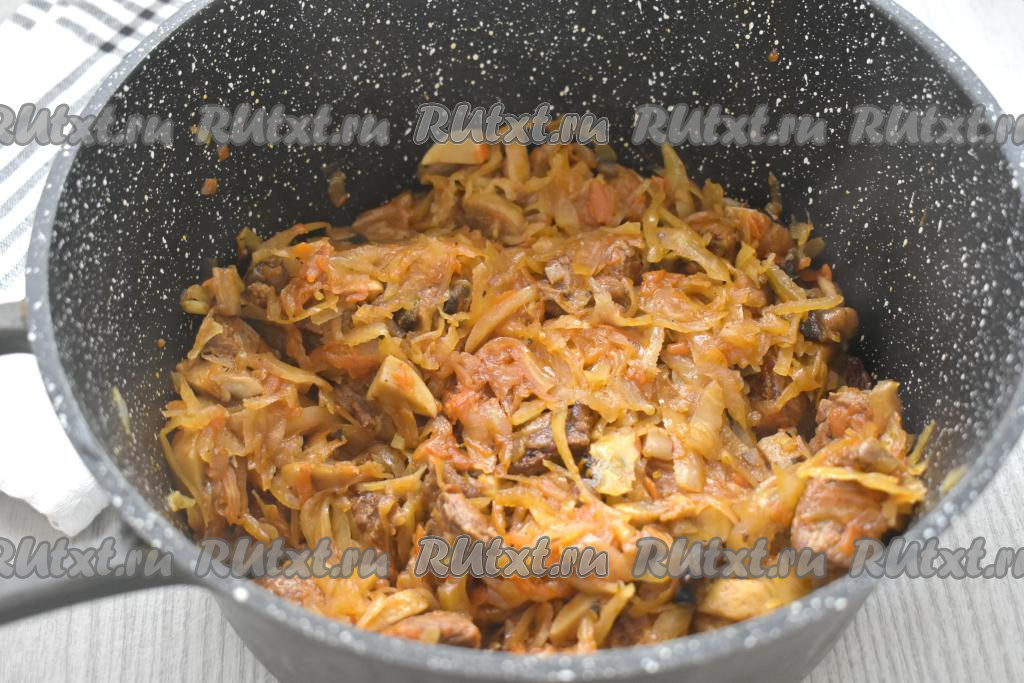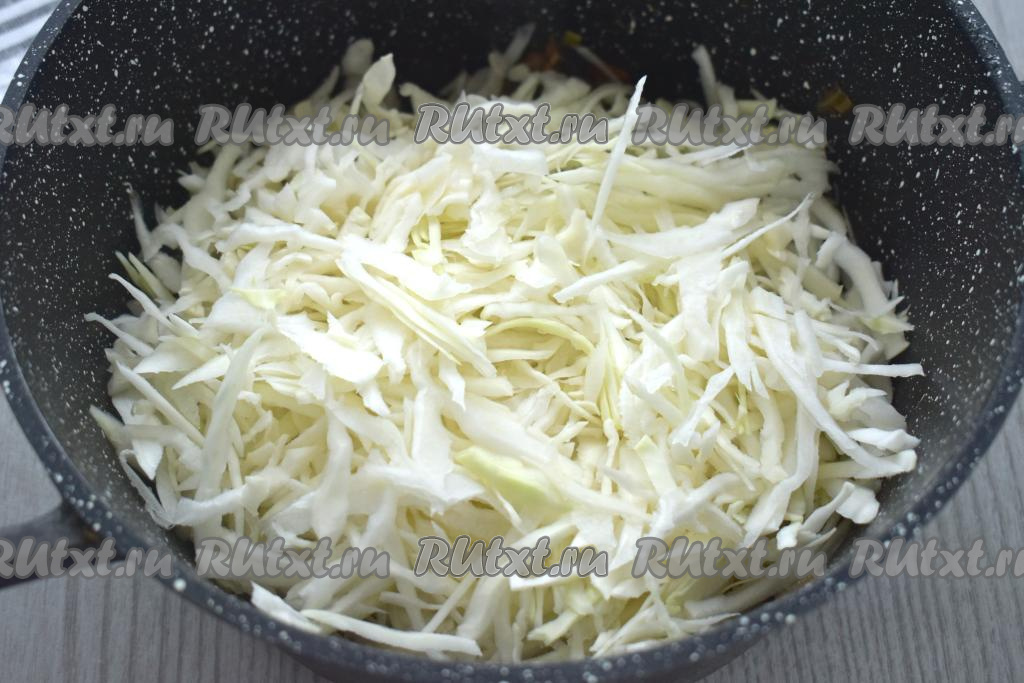 Затем к говядине, овощам и грибам добавляем тонко нарезанную капусту.