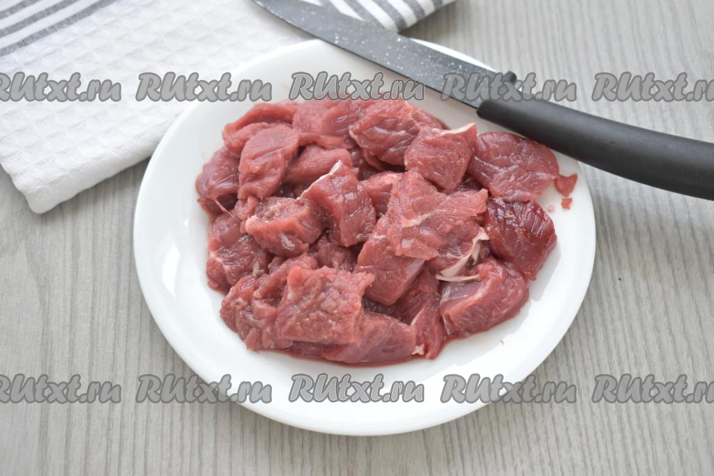 Мякоть говядины моем, обсушиваем, нарезаем на средние кусочки.