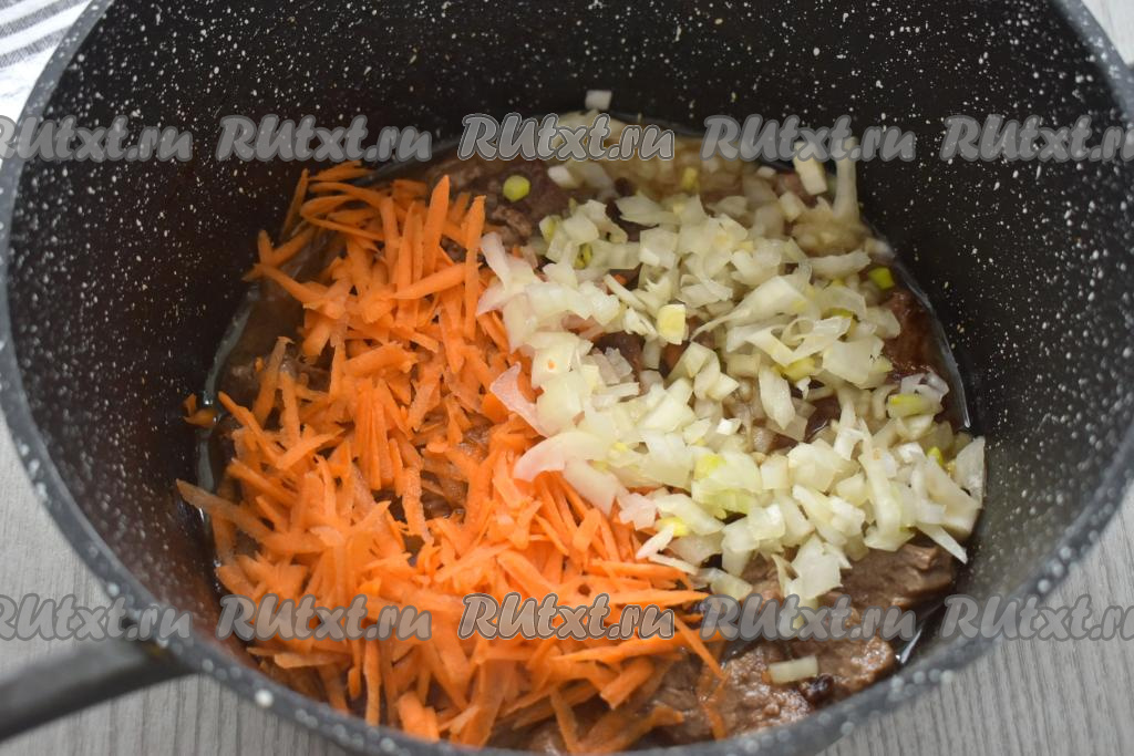 Пока тушится говядина, очищаем морковку и лук. Натираем морковь на крупной тёрке. Лук нарезаем мелко. К мясу, протушившемуся в течение 20 минут, добавляем морковку с луком, перемешиваем овощи и обжариваем на среднем огне 6-7 минут (до мягкости моркови), время от времени помешивая.