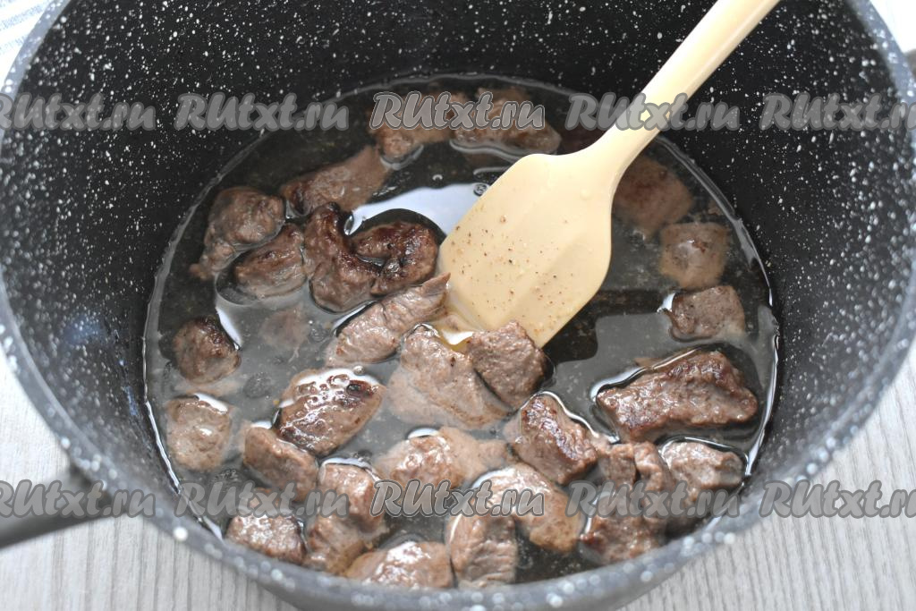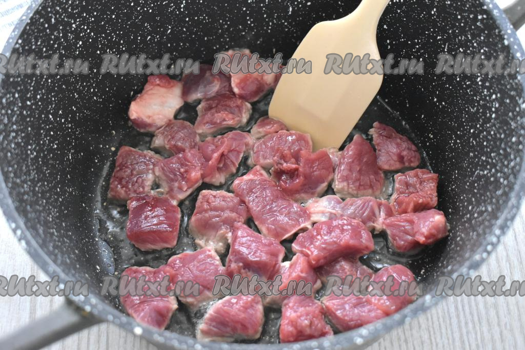 Готовить это блюдо лучше всего в глубокой сковороде или в кастрюле с толстым дном. В кастрюле (или в сковороде) прогреваем растительное масло, после этого выкладываем нарезанную говядину. На достаточно сильном огне обжариваем кусочки мяса, периодически перемешивая, 8-10 минут. На поверхности говядины появится корочка, но внутри она ещё останется сырой.