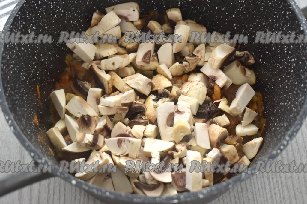 Пока обжариваются овощи с говядиной, моем шампиньоны, нарезаем на средние кусочки. После того как морковка станет мягкой, добавляем к говядине с овощами нарезанные грибы, перемешиваем, обжариваем 7-8 минут, периодически перемешивая.