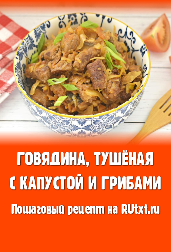 Мягкие кусочки тушёной говядины вместе с нежными грибами и сочной капустой раскладываем по тарелкам, по желанию, посыпаем нарезанной свежей зеленью. Вкусное, насыщенное, ароматное блюдо в горячем виде подаём к столу.