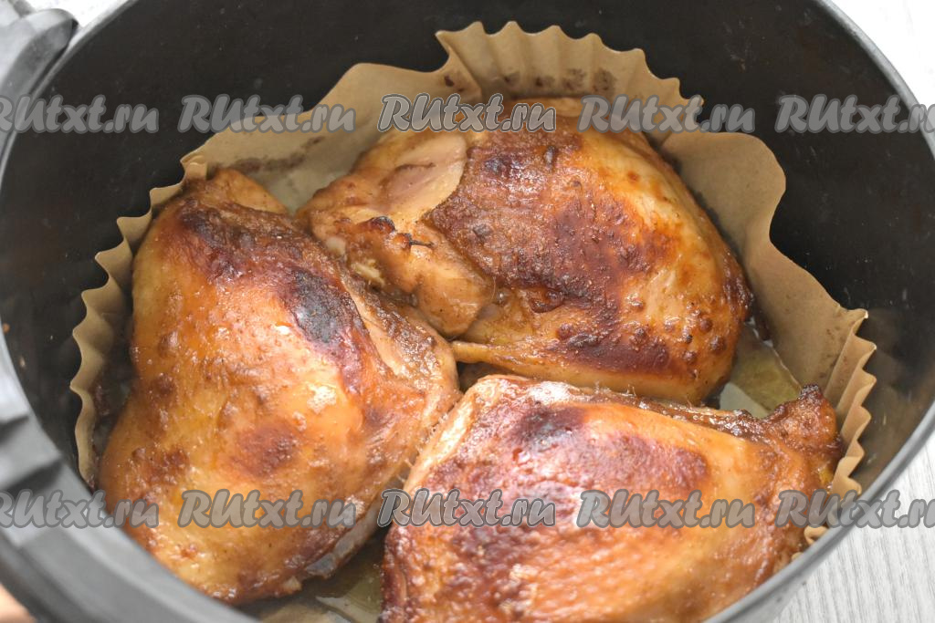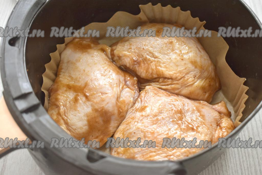 Чашу аэрогриля застилаем пергаментом. Куриные бёдра, замаринованные в соусе "Терияки", выкладываем кожей вверх в чашу аэрогриля. Отправляем чашу в аэрогриль. Включаем аэрогриль на 40 минут, температуру выставляем на 180 градусов. Через 20 минут с начала запекания куриные бёдра переворачиваем и продолжаем запекать оставшиеся 20 минут.