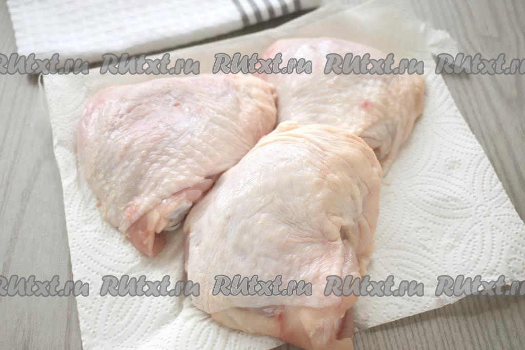 Куриные бёдра моем, срезаем с них лишний жир, обсушиваем бумажными полотенцами.