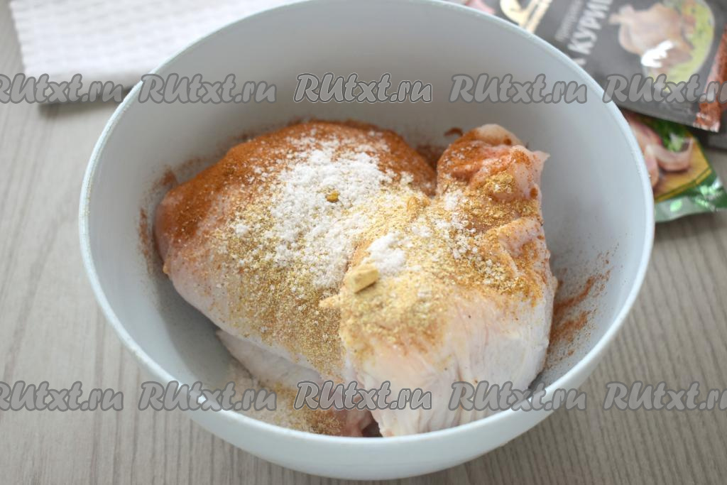 Перекладываем куриные бёдра в миску. По вкусу их солим, приправляем специями (я добавила молотую паприку и сушёный чеснок). Количество соли регулируйте самостоятельно, оно будет зависеть от вкуса соуса "Терияки", который вы используете. Тщательно натираем бёдрышки солью и специями со всех сторон.