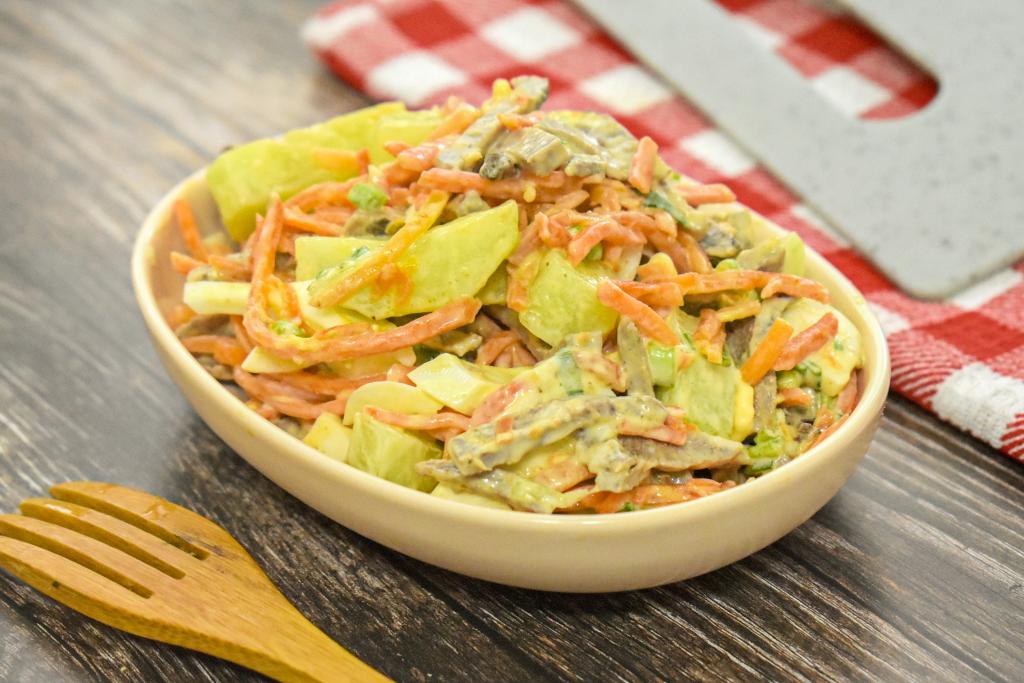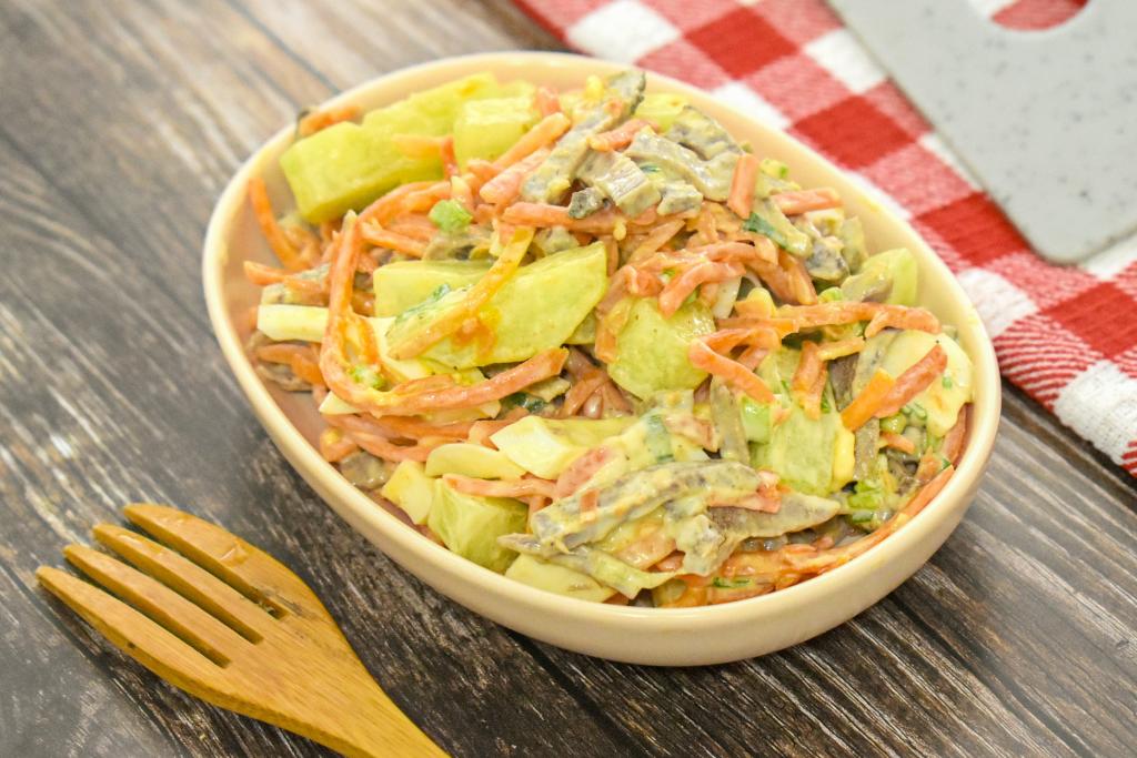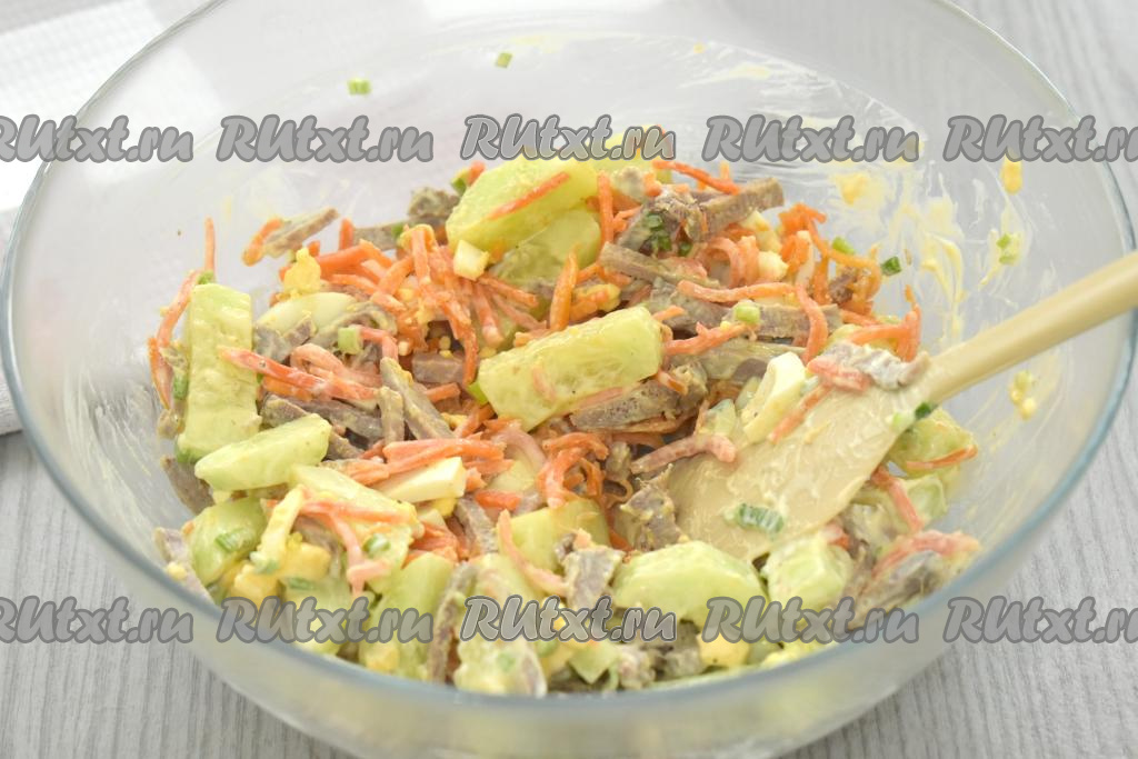 Субпродукты отлично подходят для приготовления различных блюд, в том числе и салатов. В этот раз решила приготовить салат из варёного свиного языка с добавлением корейской моркови, свежего огурца и яиц. Салат получился аппетитным, насыщенным и очень вкусным. Все составляющие в нём отлично сочетаются и дополняют друг друга. Нежный язык, пикантная корейская морковка и сочный огурчик создают приятную гармонию вкусов. Это блюдо можно подать и к праздничному столу, и к семейному ужину.