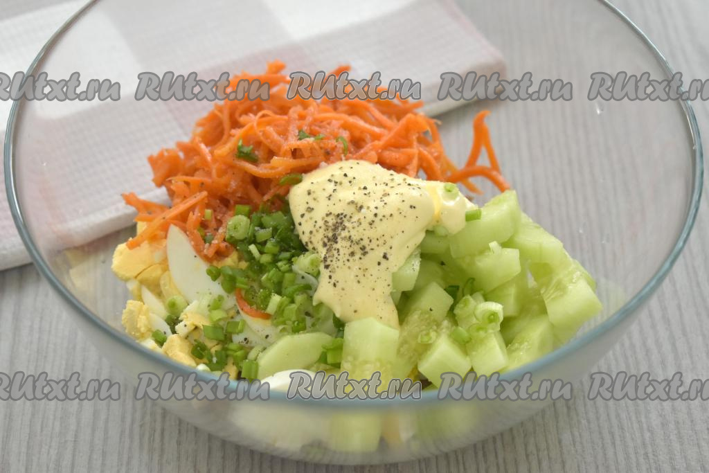 Салат перчим, заправляем майонезом, перемешиваем. Перец можно не добавлять, если корейская морковка слишком острая.