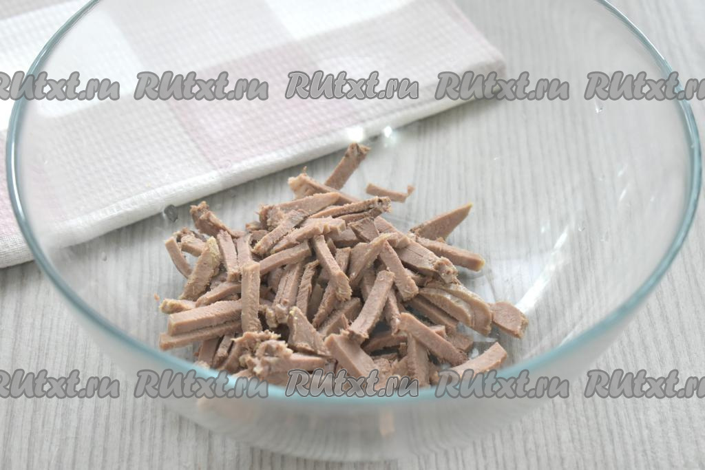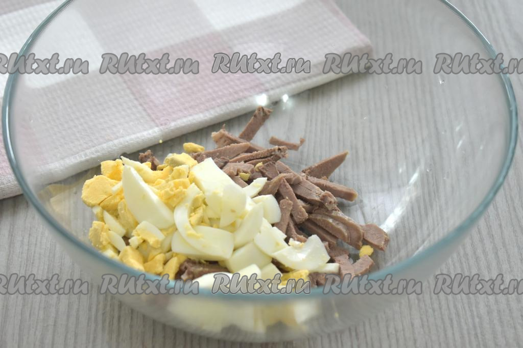 Пока язык остывает, отвариваем яйца в течение 10 минут с момента закипания воды, даём им остыть. Остывший язык нарезаем на тонкие брусочки, выкладываем в миску.