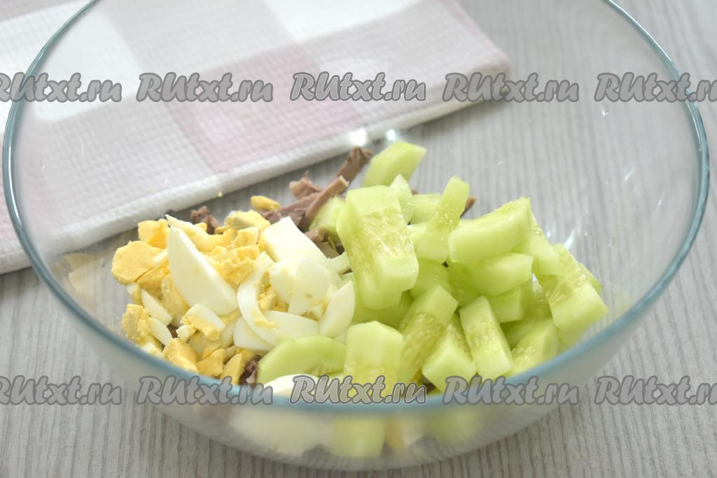 Огурец моем, очищаем от кожуры, нарезаем на небольшие брусочки, выкладываем в миску с яйцами и языком.