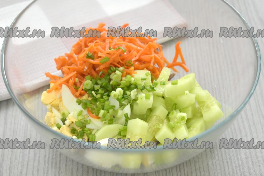 Зелёный лук моем, нарезаем. Корейскую морковь отжимаем от маринада, в котором она находилась. Длинные полоски моркови нарезаем на 3-4 части. В миску с салатом из свиного языка, яиц и огурца добавляем корейскую морковь и зелёный лук.