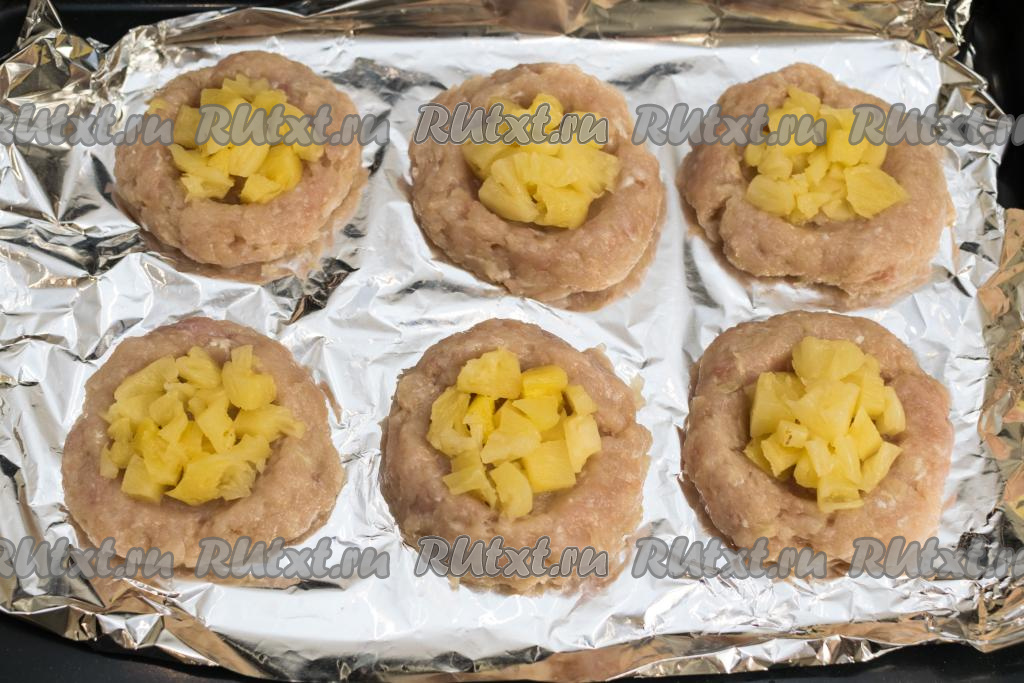 Разложить кусочки ананасов в углубления мясных гнёзд из фарша и отправить в разогретую до 180 градусов духовку на 25 минут.