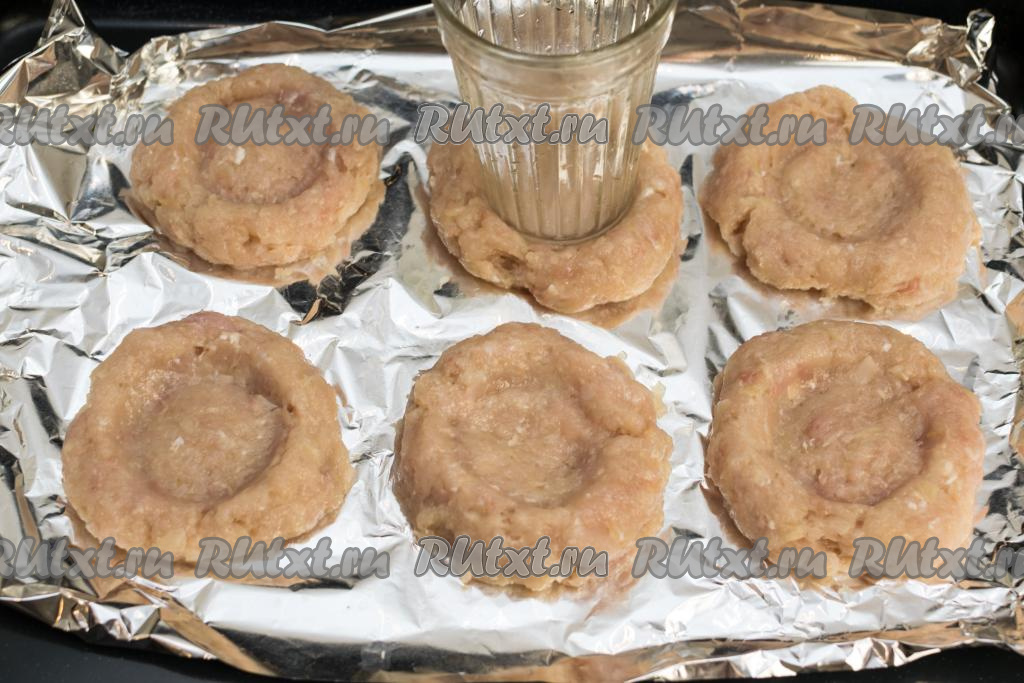 Разделить фарш на 6 равных частей. Периодически смачивая руки водой, каждую часть фарша скатать в шарик. Противень застелить фольгой. На расстоянии друг от друга выложить на противень шарики из фарша, слегка приплюснуть каждый шарик рукой, получится достаточно плоская котлета. При помощи дна обычного стакана сделать в середине каждой котлеты углубление, формируя мясные гнёзда из фарша, как на фото. Если стакан пристаёт к фаршу, тогда смочите его немного водой.