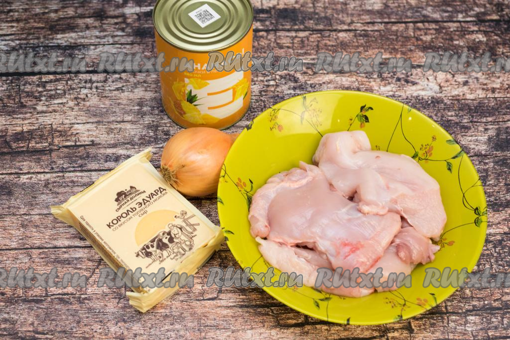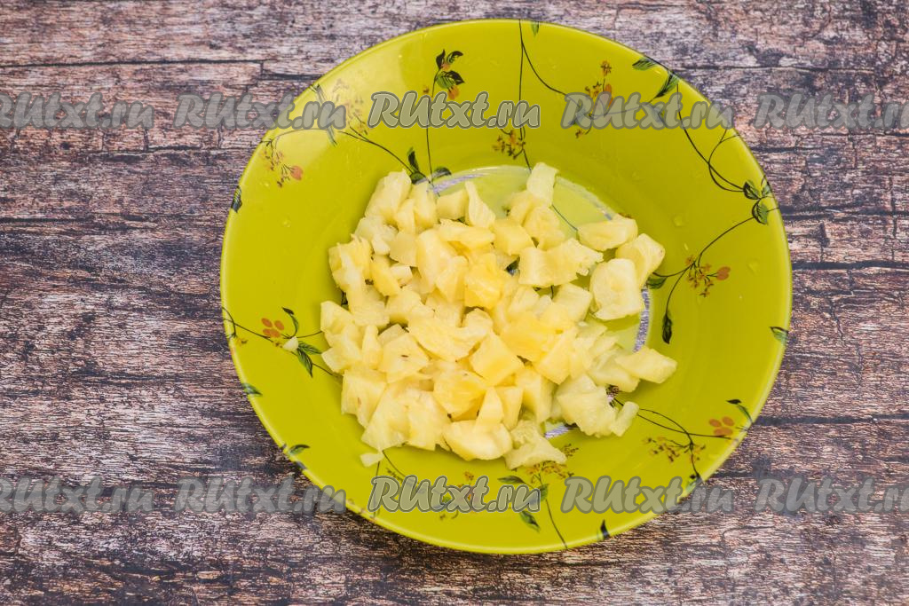 Дольки консервированного ананаса нарезать на небольшие кусочки.