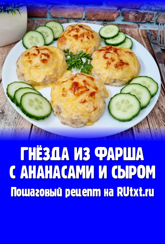 Если хочется разнообразить семейный ужин или приготовить что-то интересное в качестве основного блюда на праздничный стол, тогда можно запечь в духовке мясные гнёзда из фарша с начинкой из ананаса и сыра. Готовится это блюдо несложно, а получается аппетитным, вкусным и достаточно сытным. Ананасы очень удачно сочетаются с мясным фаршем, делая гнёзда более сочными и нежными. Фрукты придают мясу небольшую сладость, но ананас не доминирует, он очень гармонично дополняет все составляющие этого блюда. Сырная корочка делает вкус более интересным, а внешний вид - аппетитным. Нам очень понравились мясные гнёзда, запечённые по этому рецепту, советую и вам попробовать!
