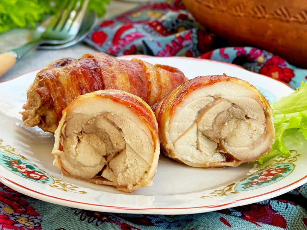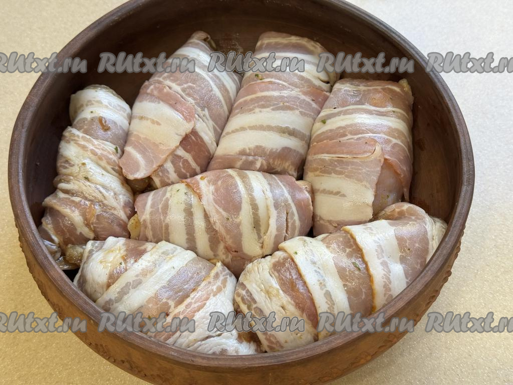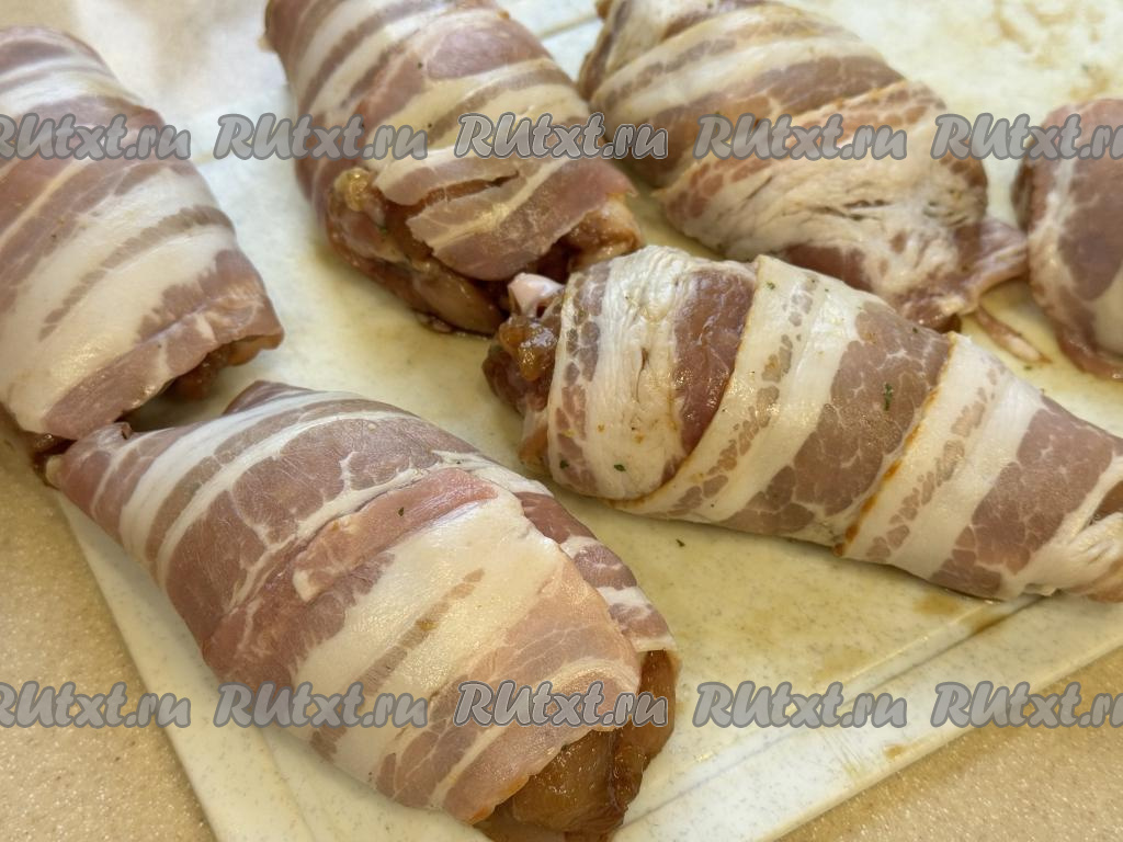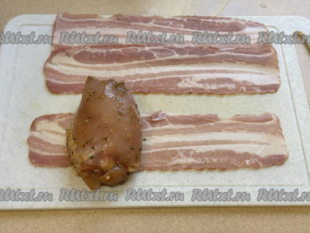По прошествии часа каждое филе бедра свернуть в рулет, а затем завернуть в полоску бекона.