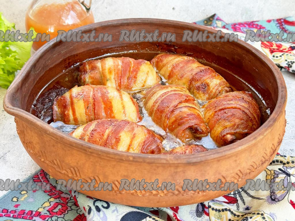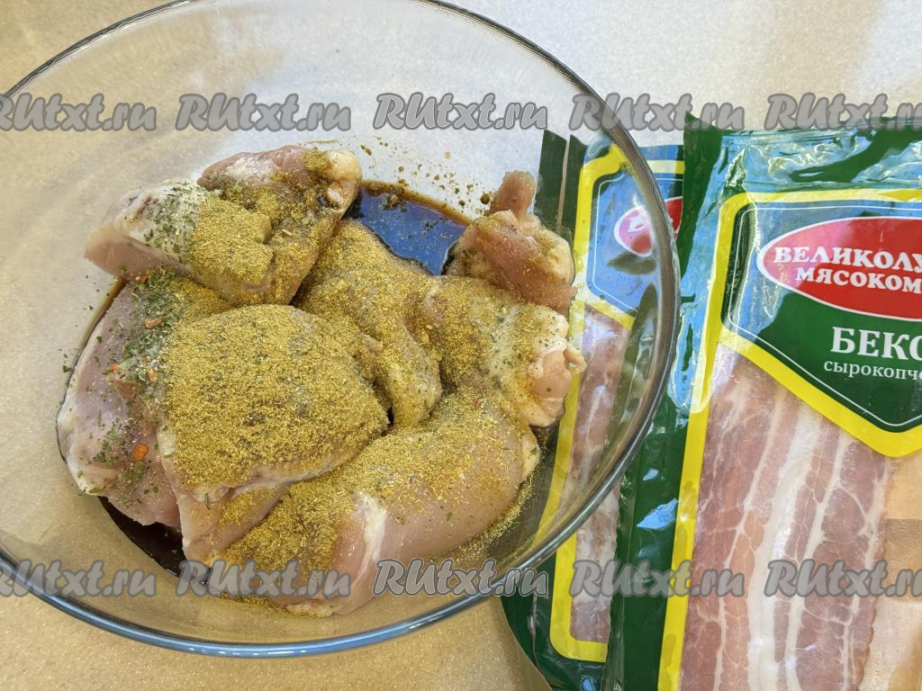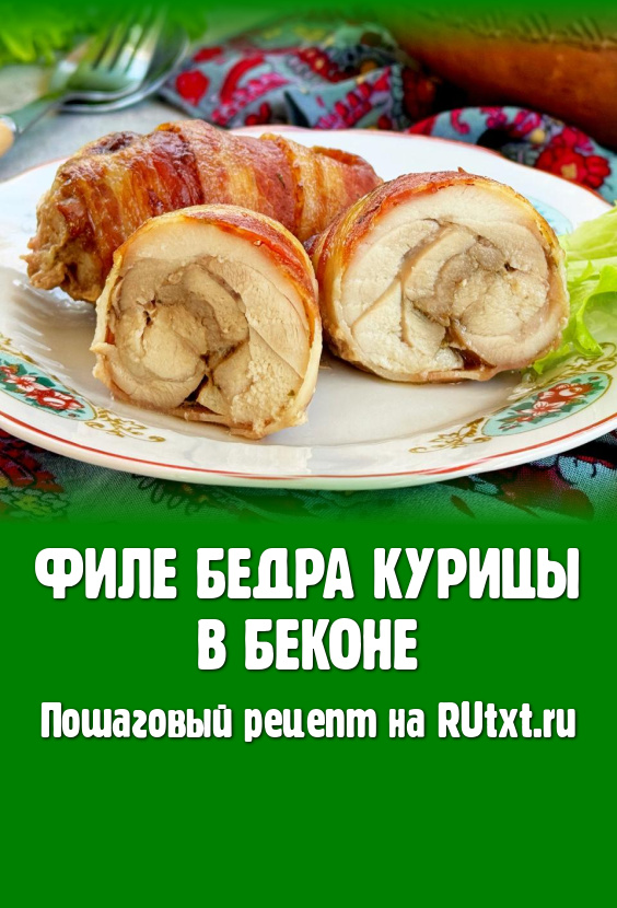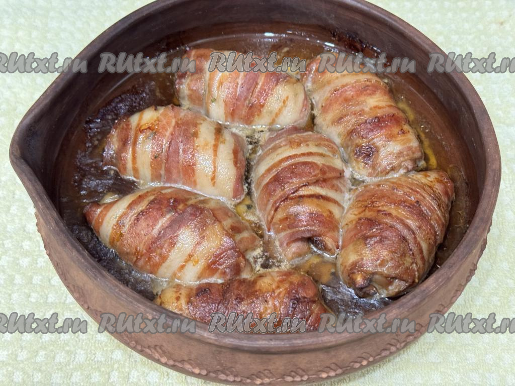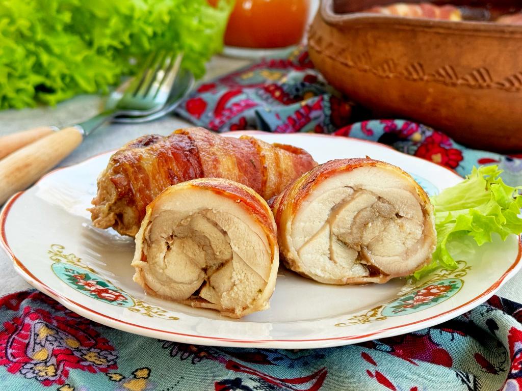 По прошествии часа каждое филе бедра свернуть в рулет, а затем завернуть в полоску бекона.