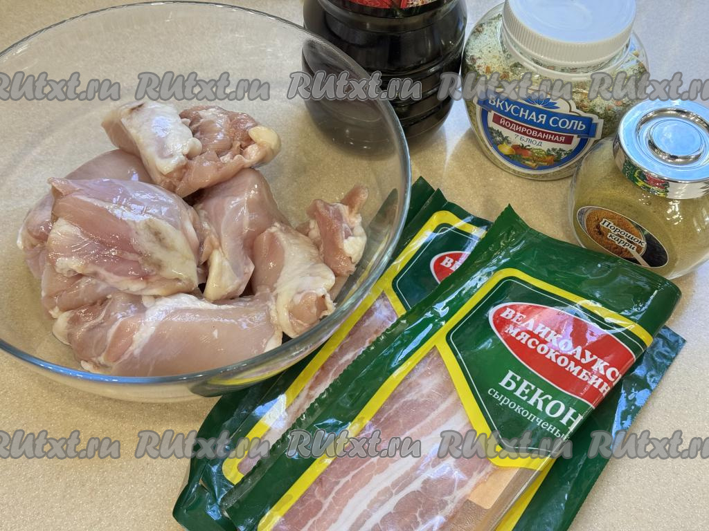 Подготовить продукты. Можно купить в магазине филе куриного бедра, уже отделённое от костей, а можно приобрести куриные бёдрышки и разделать их на филе в домашних условиях, удаляя кости и кожу. Филе куриных бёдер промыть водой, обсушить, выложить в глубокую миску. Бекон я взяла сырокопчёный, уже нарезанный на полоски.