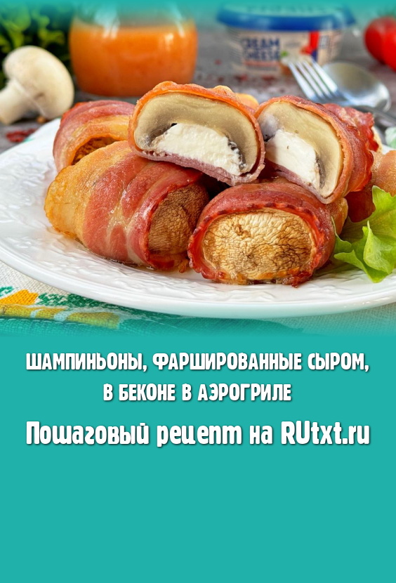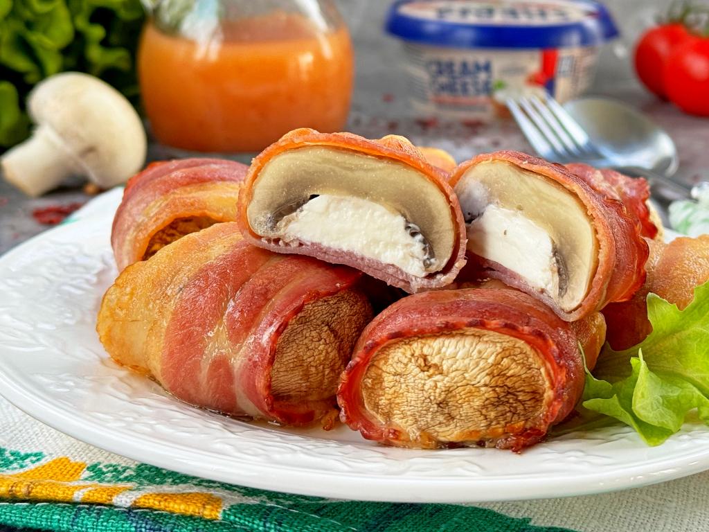 Вкусные, сочные шампиньоны, фаршированные сыром, завёрнутые в бекон, переложить из чаши аэрогриля на тарелку и горячими подать к столу.