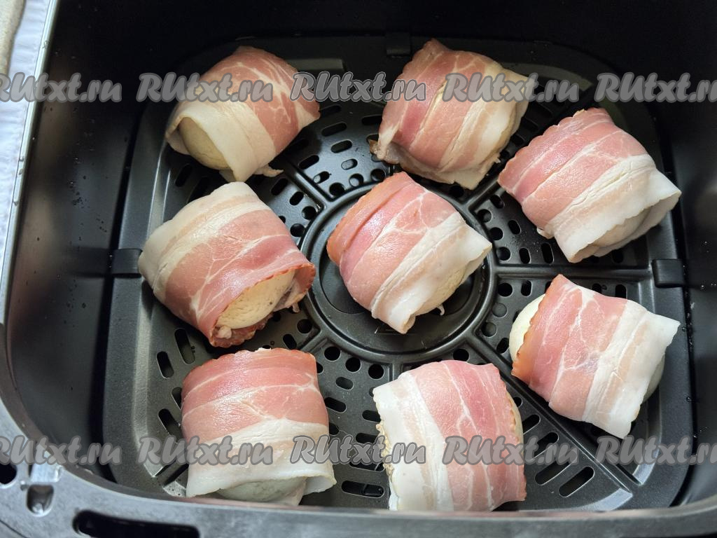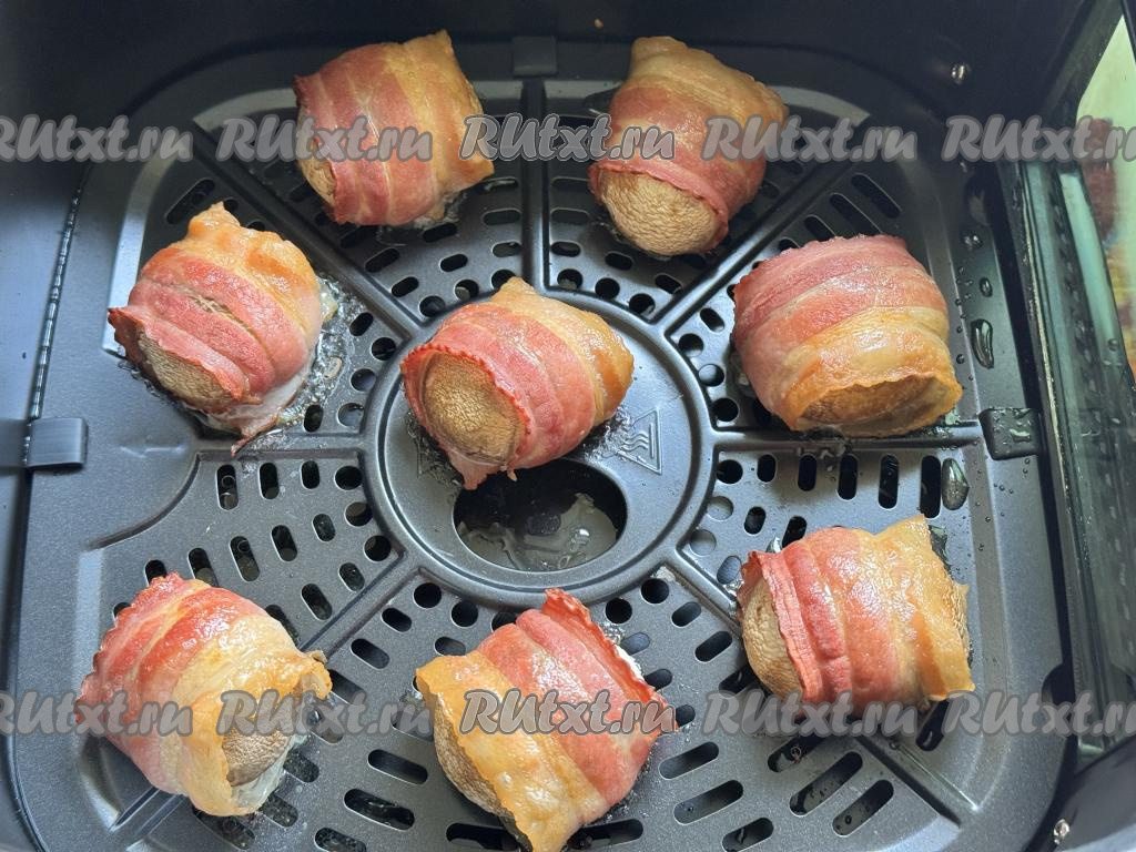 Шампиньоны, фаршированные сыром, завёрнутые в бекон, выложить в один слой на решётку чаши аэрогриля.